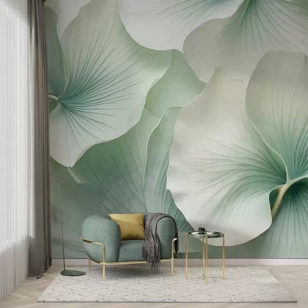 Fototapet Vita och gröna ginkgoblad, mjuk struktur, abstrakt blommig bakgrund, minimalistisk modern stil Nr. w09421
