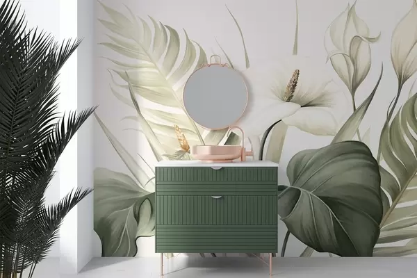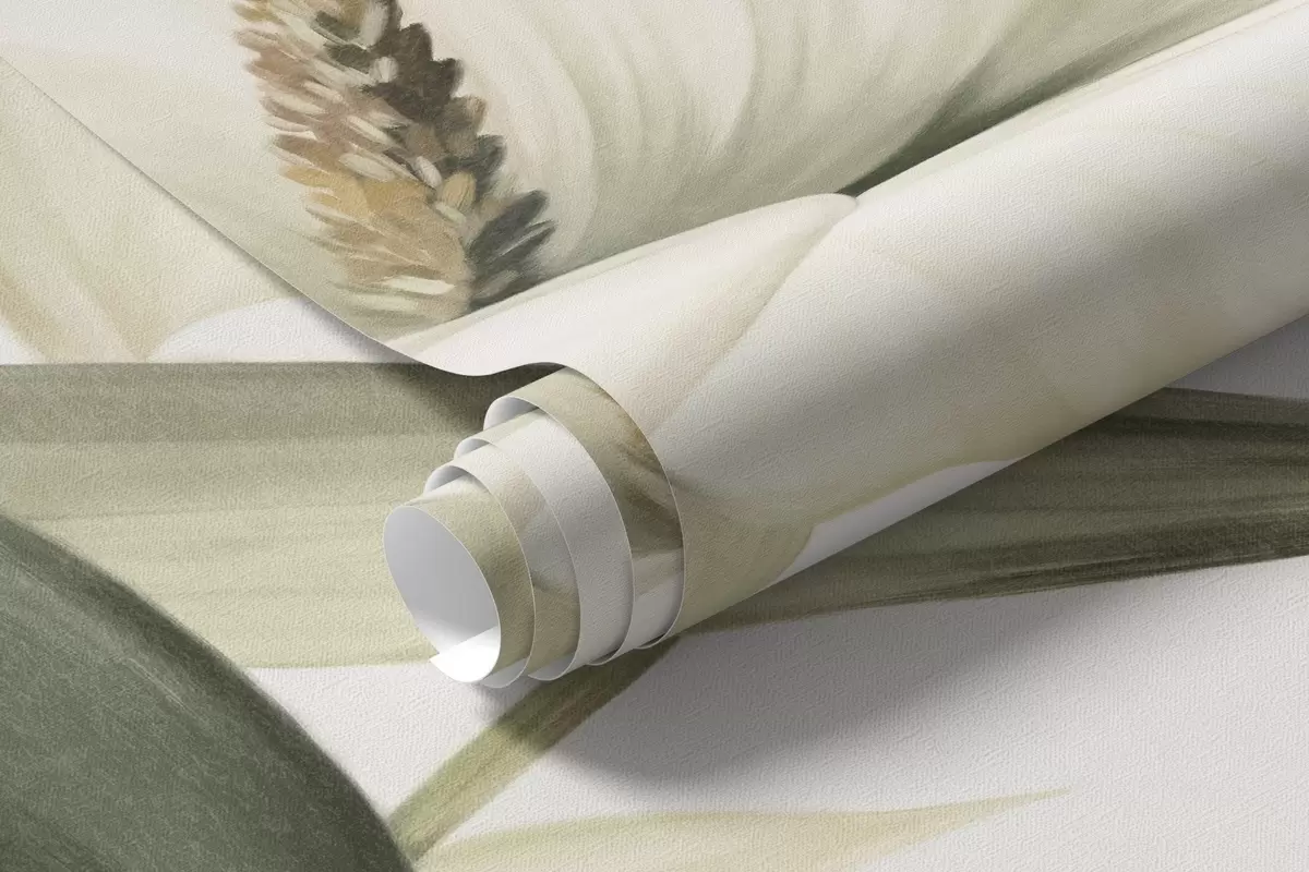 Fototapet Vita callaliljor och gröna tropiska blad, botanisk illustration, ljus bakgrund, vintage-stil, texturerad Nr. w09423