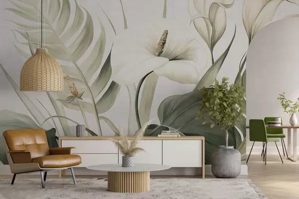 Fototapet Vita callaliljor och gröna tropiska blad, botanisk illustration, ljus bakgrund, vintage-stil, texturerad Nr. w09423