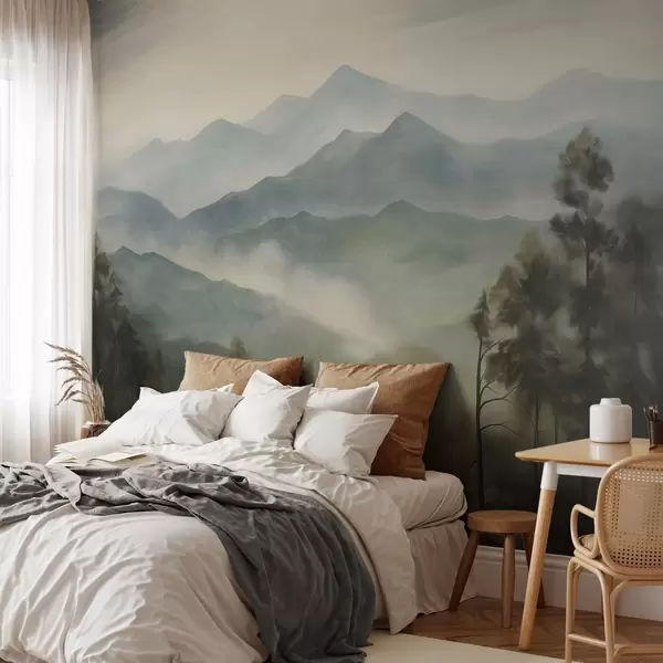 Fototapet Dimma över bergskedjan med träd, molnigt väder, dämpade färger, landskapsmålningsstil w09424