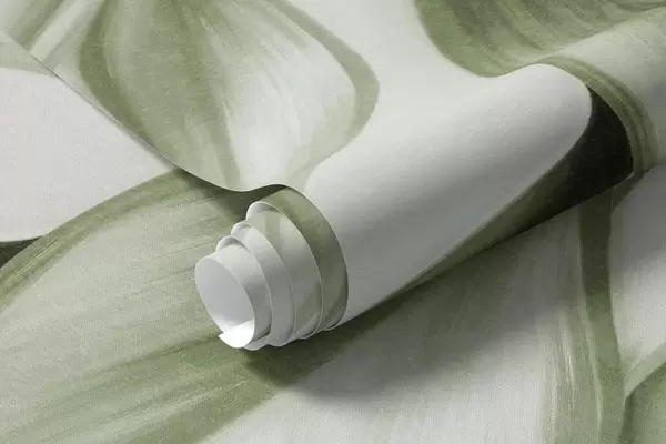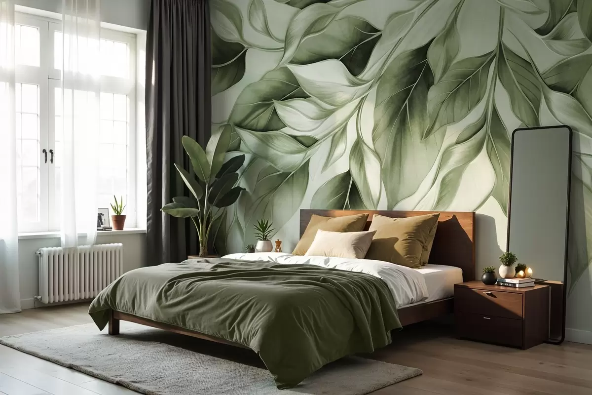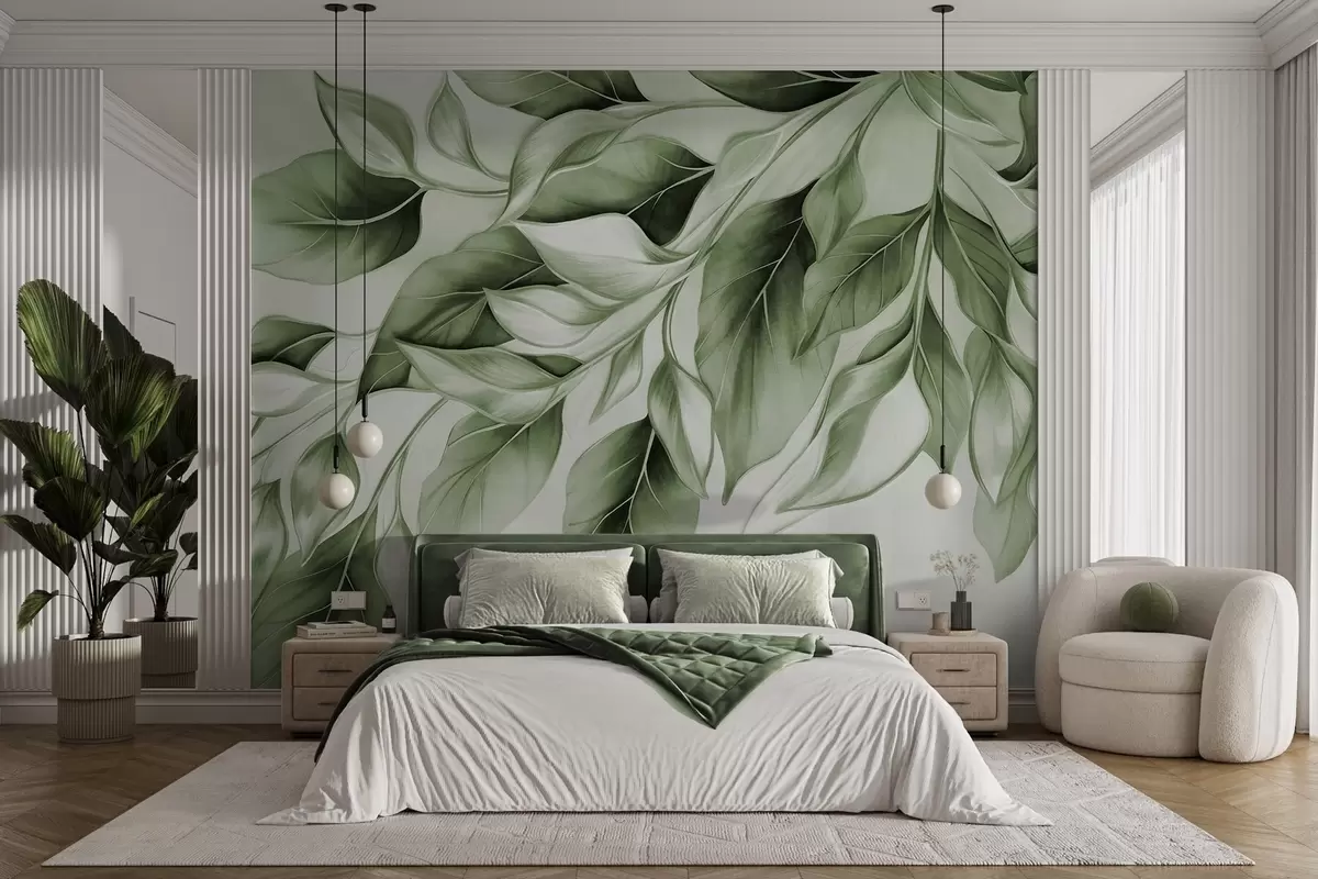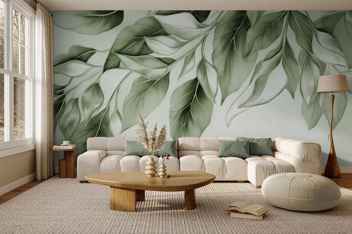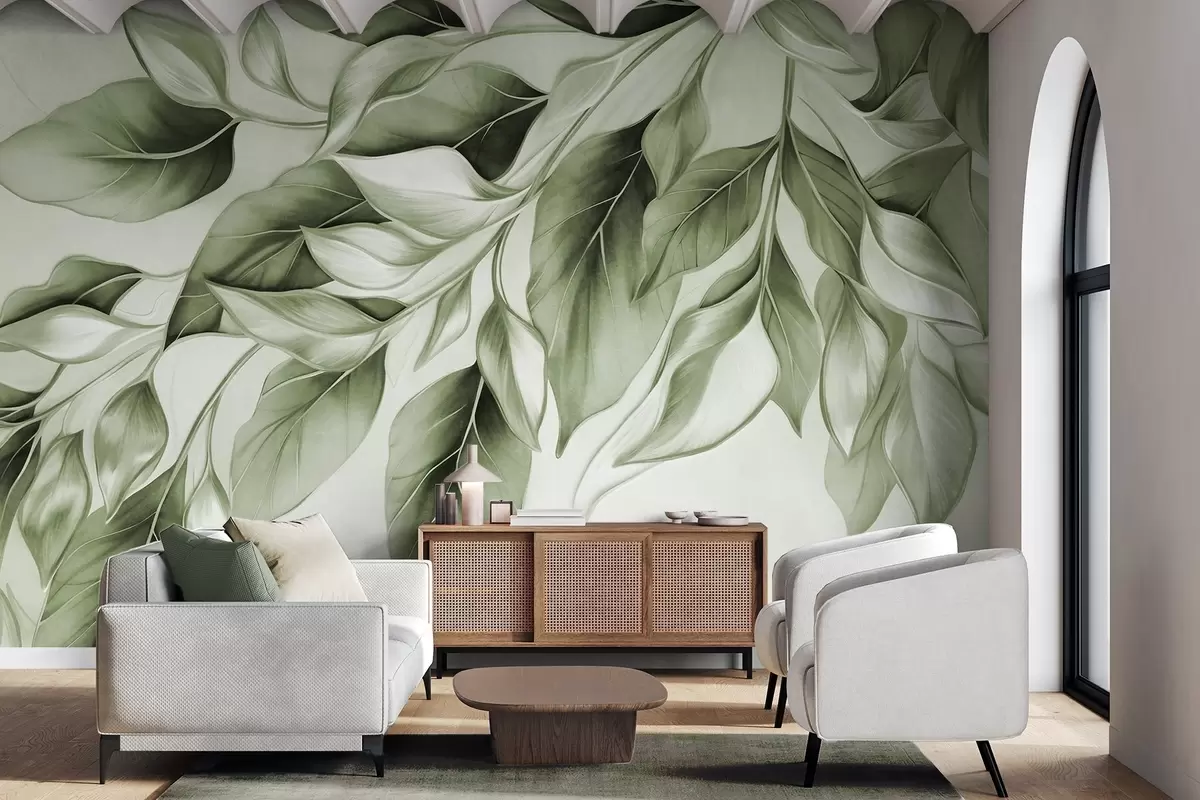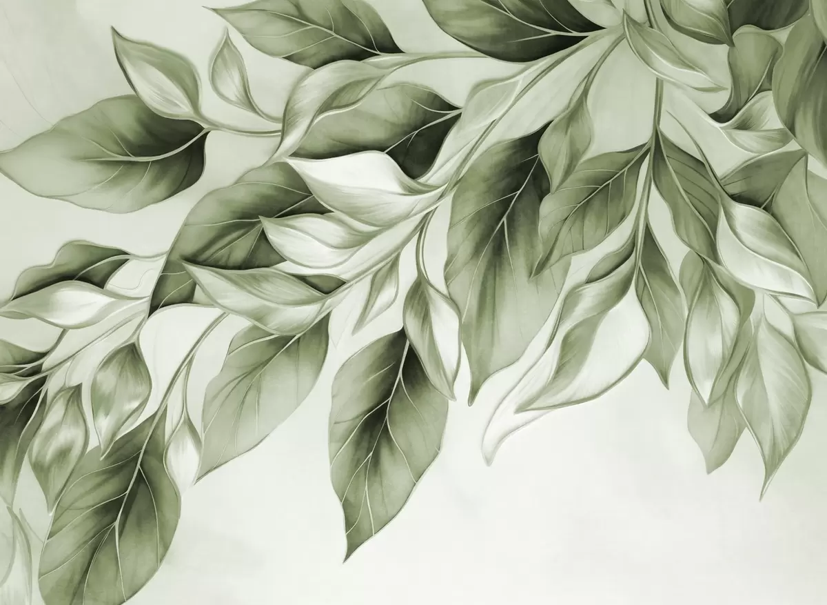 Fototapet Strukturerade dämpade gröna blad, ljus bakgrund, elegant och konstnärlig design, modern stil Nr. w09429v1