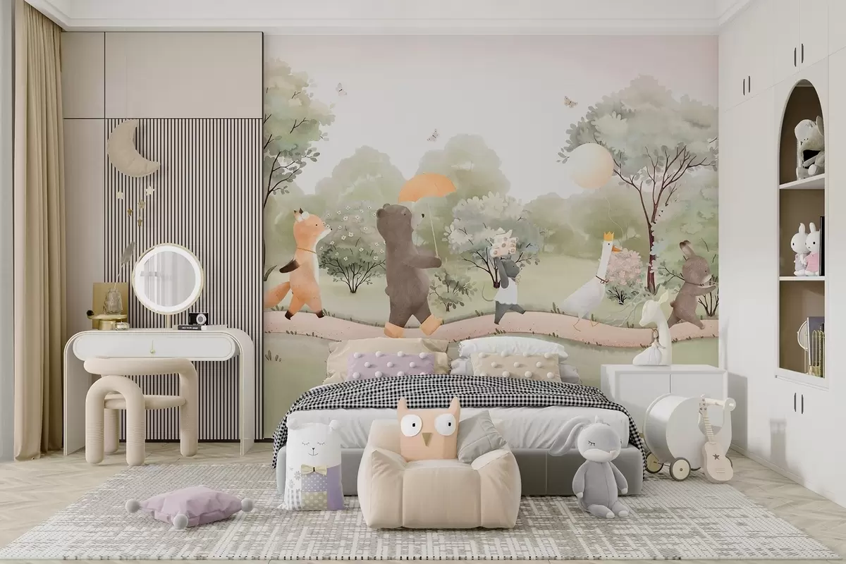 Fototapet Festlig resa med små djur genom skogen i akvarellstil Nr. w09440