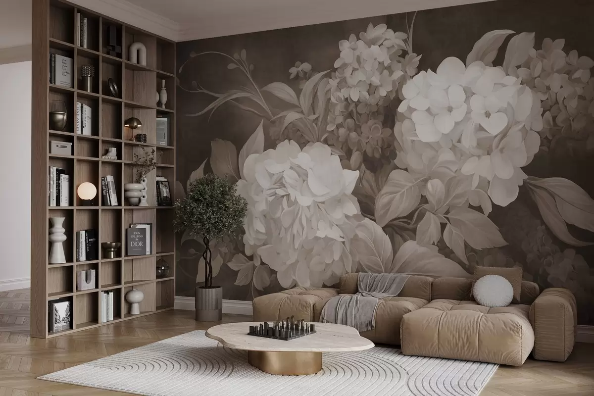 Fototapet Strukturerad sepiafärgad målning som imiterar hortensia blommor med stora blad, abstrakt och mörk bakgrund Nr. w09465