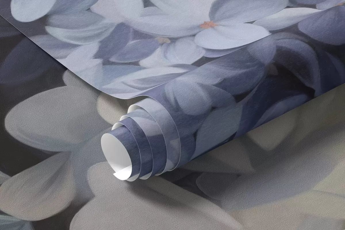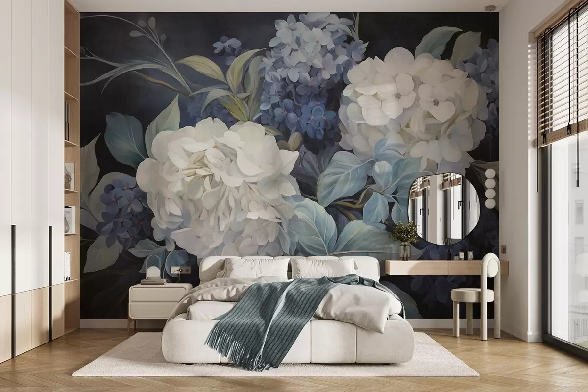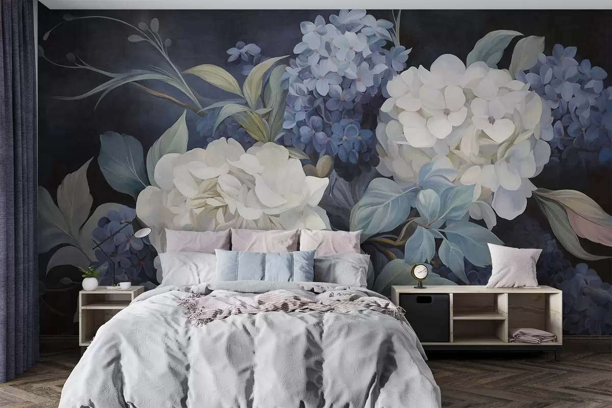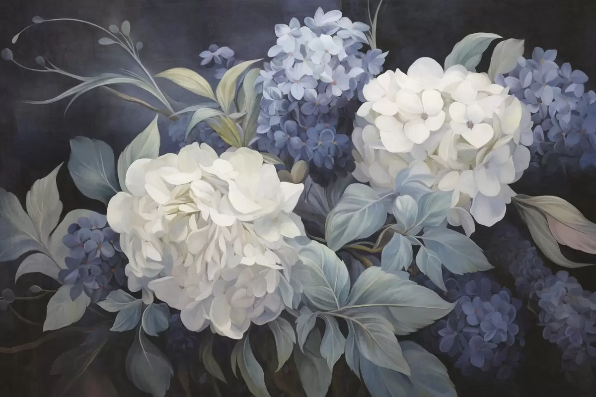 Fototapet Texturerad mörkblå målning som imiterar hortensiablommor med stora blad, abstrakt och mörk bakgrund Nr. w09465v1