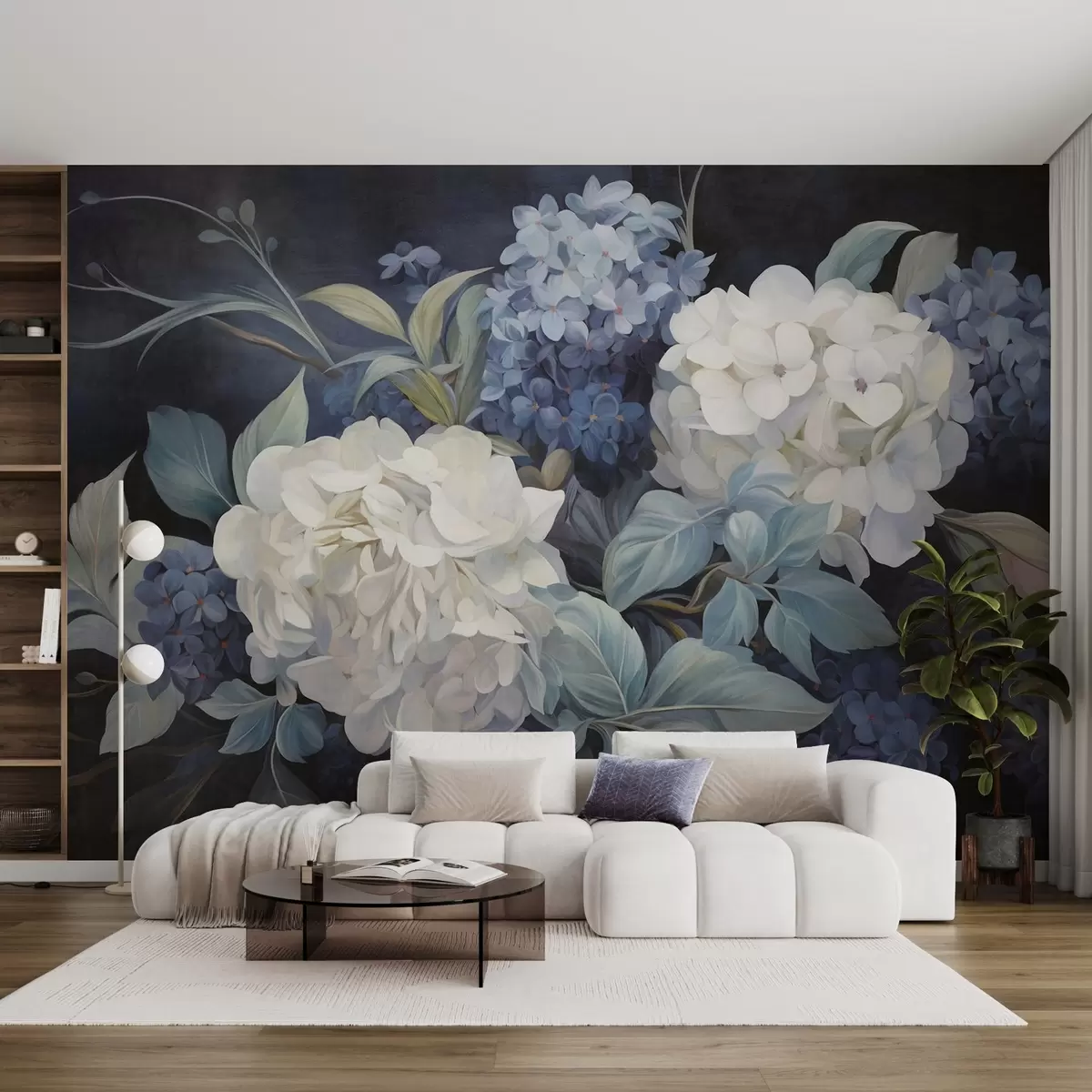 Fototapet Texturerad mörkblå målning som imiterar hortensiablommor med stora blad, abstrakt och mörk bakgrund Nr. w09465v1