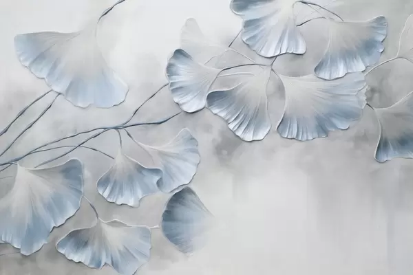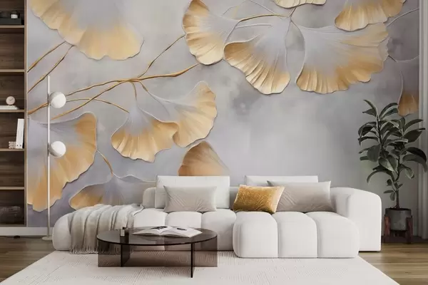 Fototapet Ginkgo biloba-blad med gula kanter på en gren, grå texturerad bakgrund, elegant och minimalistisk design Nr. w09472