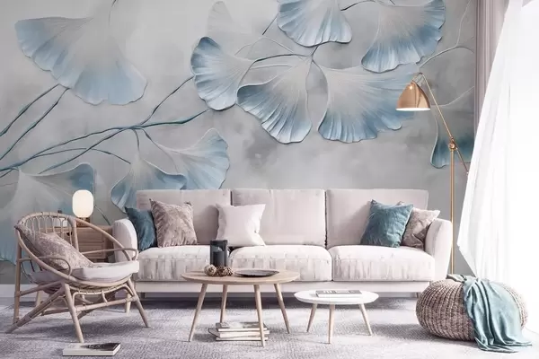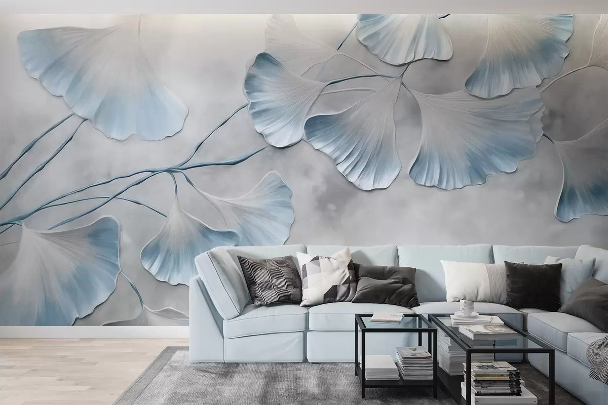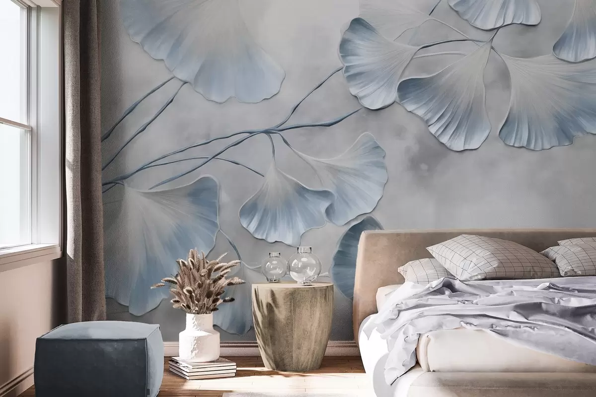 Fototapet Ginkgo biloba-blad med blå kanter på en gren, grå texturerad bakgrund, elegant och minimalistisk design Nr. w09472v1