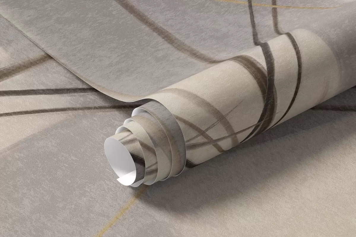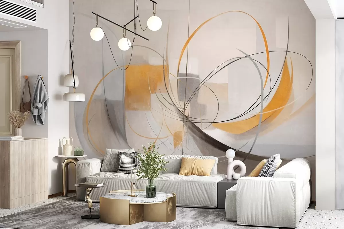 Fototapet Abstrakt texturerad modern målningsstil med böjda linjer och geometriska former i nyanser av grått, vitt och orange Nr. w09476