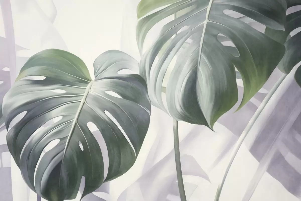 Fototapet Strukturerade monstera-blad, stora och gröna, mot en mjuk, ljus abstrakt bakgrund Nr. w09477