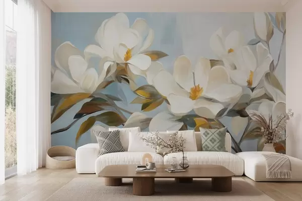 Fototapet Vita magnolior med gröna blad på ljusblå bakgrund med abstrakta penseldragsimitationer Nr. w09478
