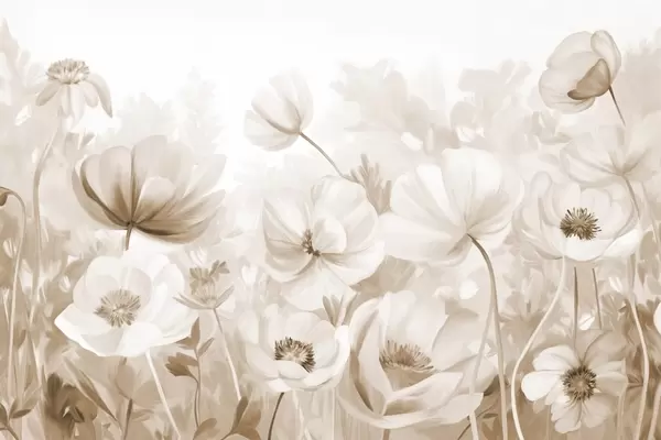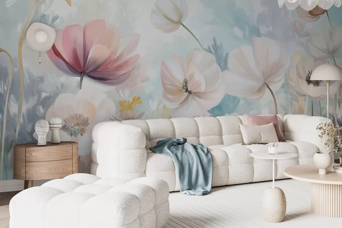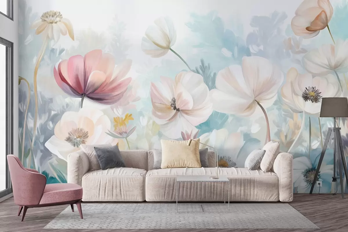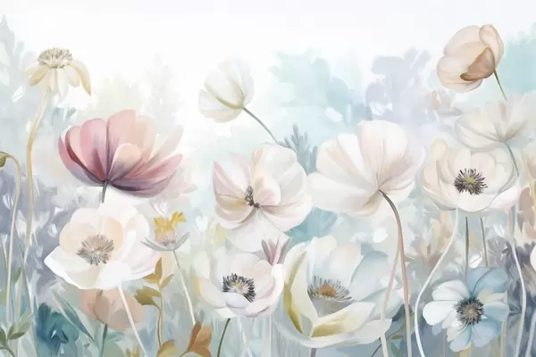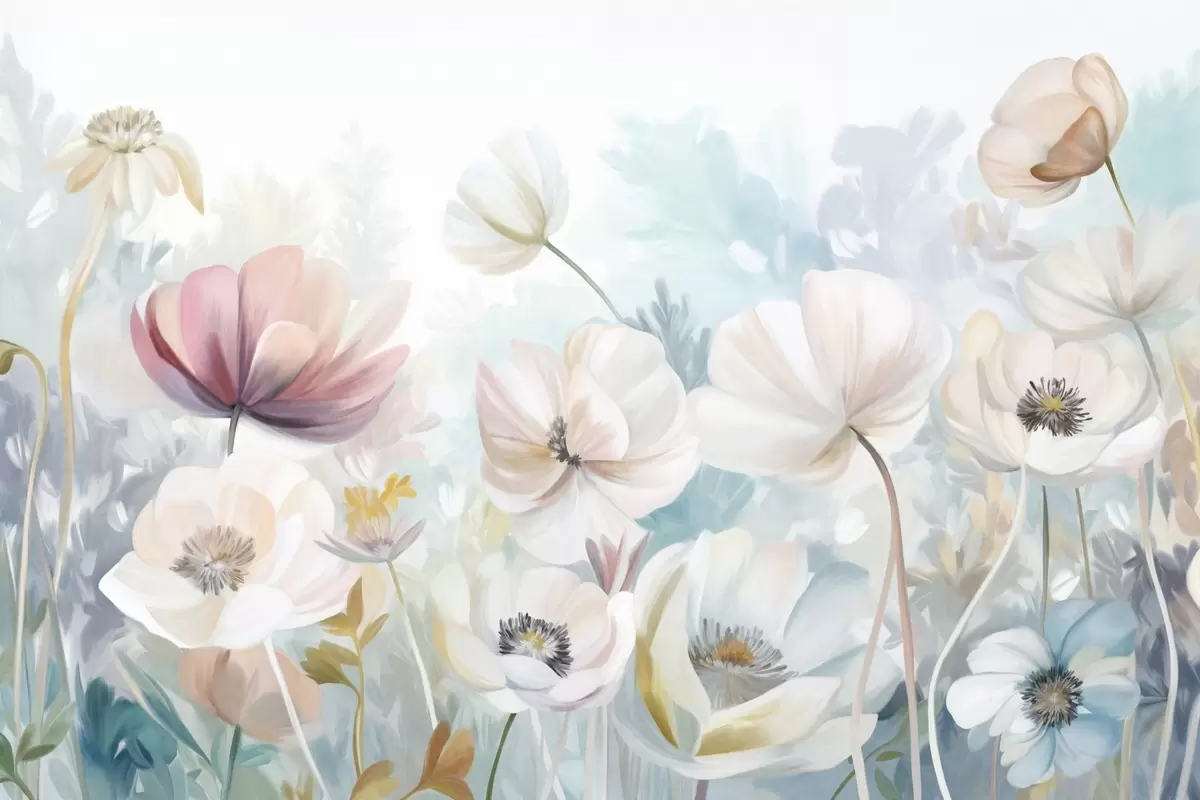 Fototapet Ett fält med pastellfärgade blommor med delikata kronblad, mjuka gröna blad, i en drömlik, strukturerad akvarellstil Nr. w09481