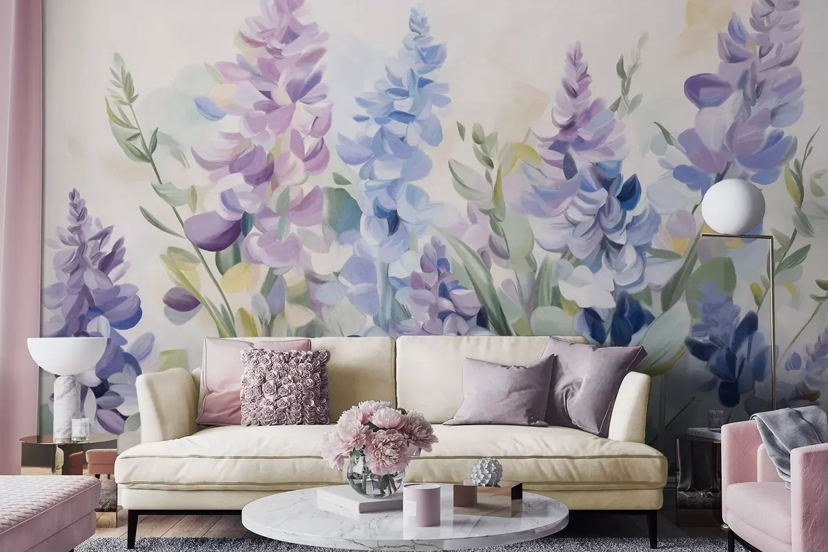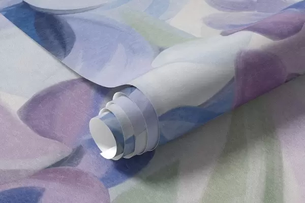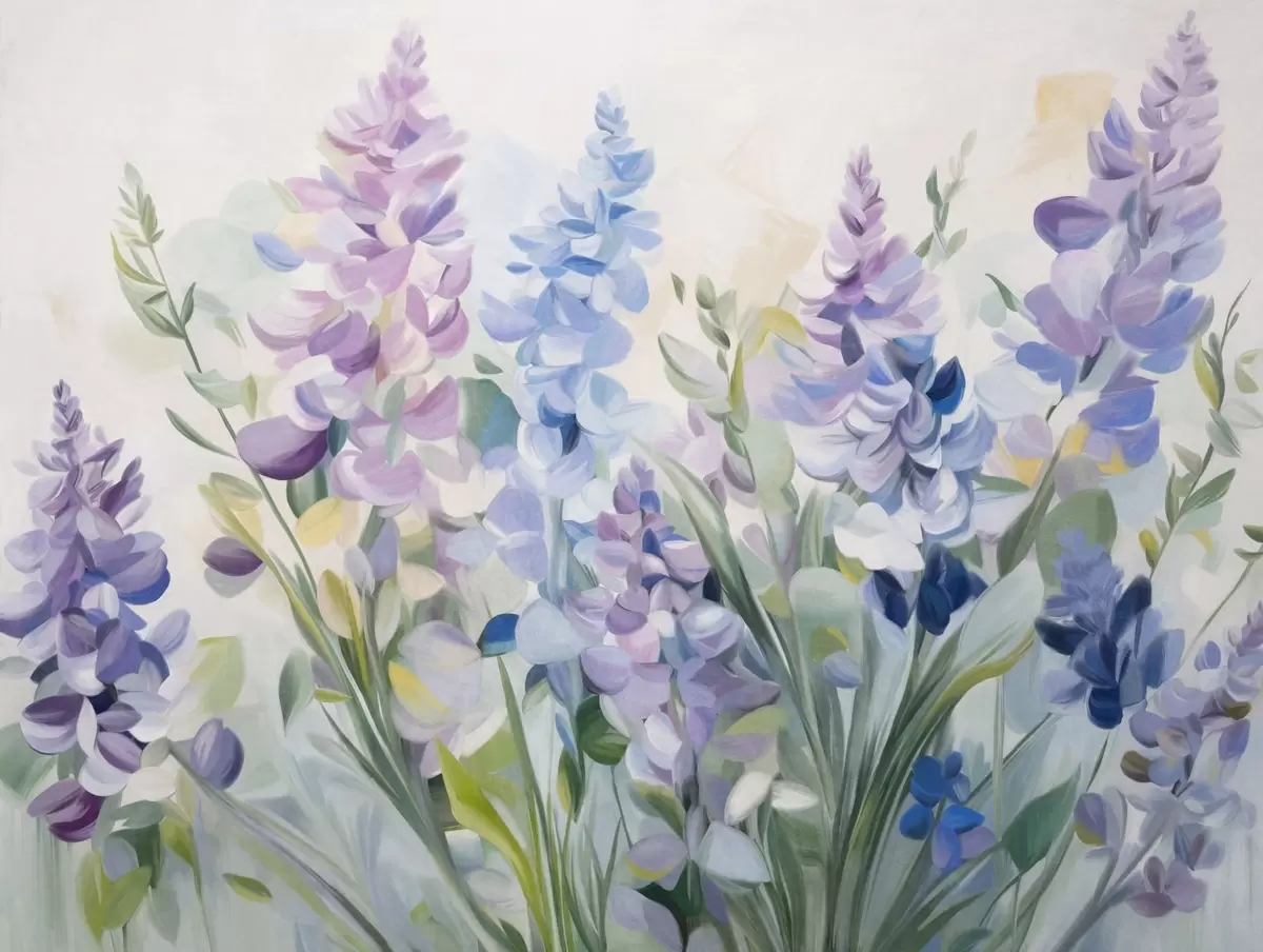 Fototapet Lila och blå texturerade blommor med blå blad, ljus bakgrund, mjuka penseldrag, livfulla färger Nr. w09482
