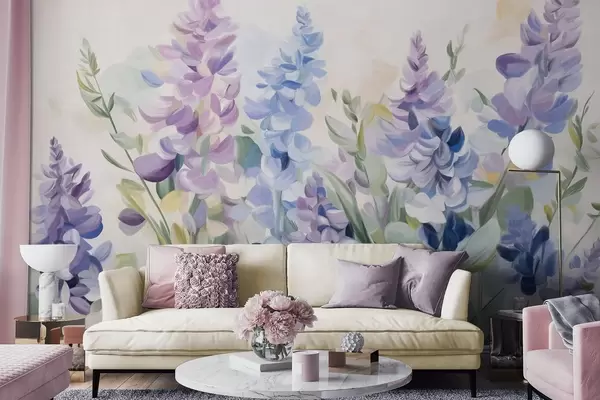 Fototapet Lila och blå texturerade blommor med blå blad, ljus bakgrund, mjuka penseldrag, livfulla färger w09482
