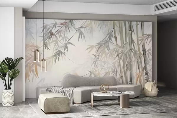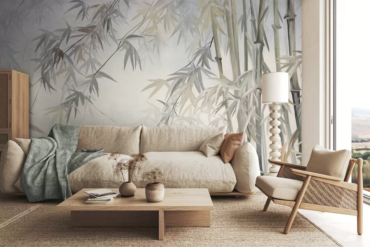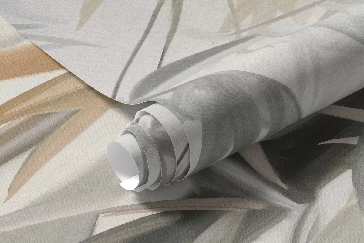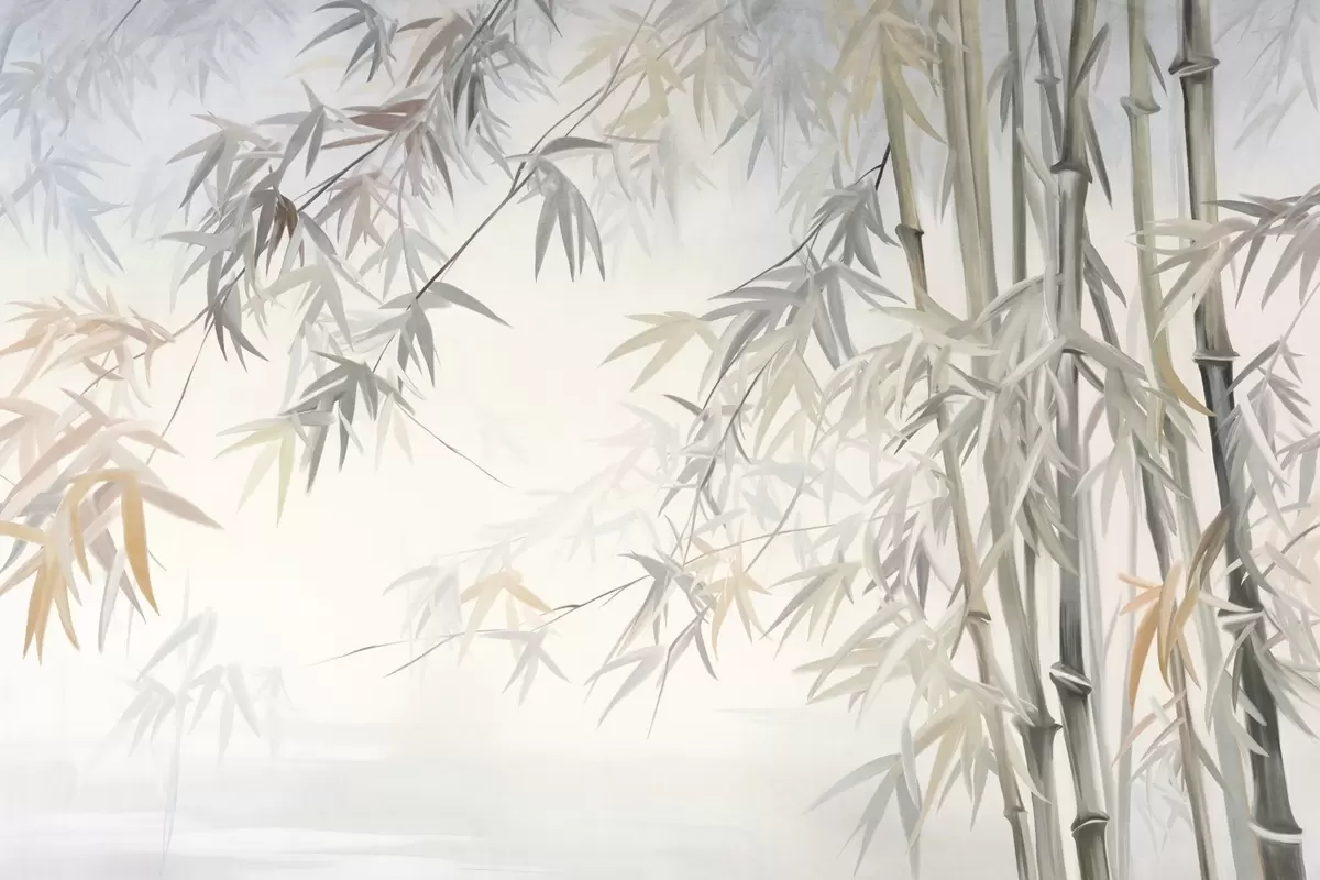 Fototapet Strukturerade bambustammar och blad i en mjuk, dämpad färgpalett av grått, vitt och krämfärgat, minimalistisk komposition Nr. w09485