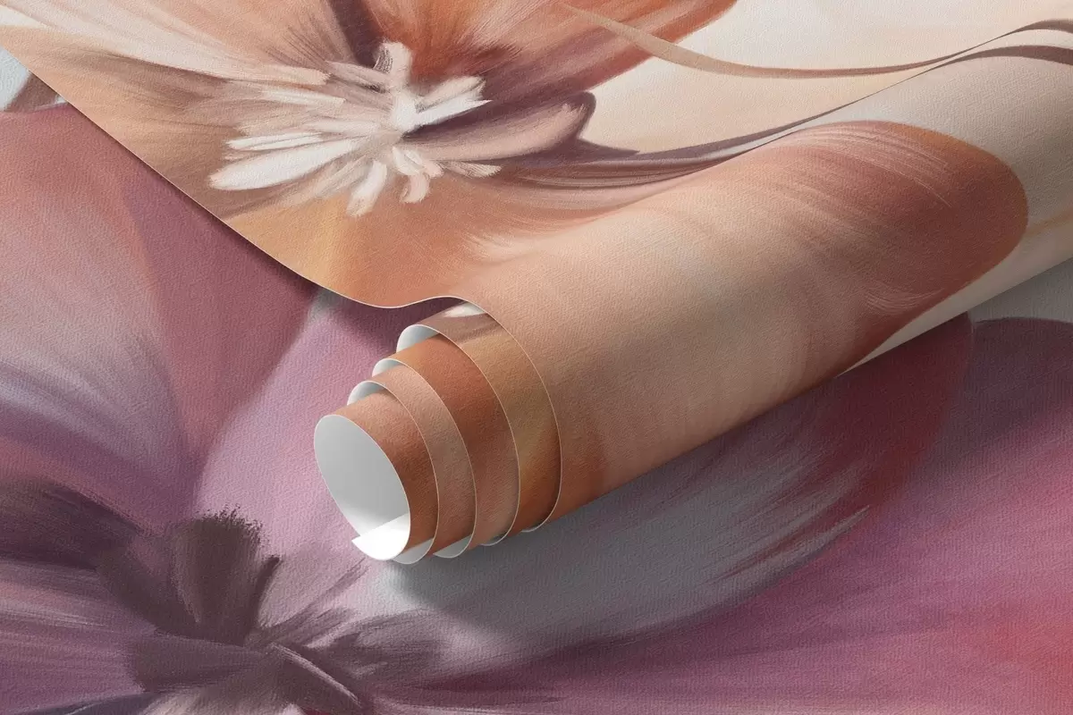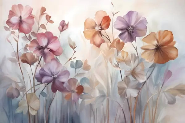 Fototapet Texturrik blomsterarrangemang med rosa, lila och orange blommor med gröna stjälkar och blad, mjuka pastellfärger Nr. w09486