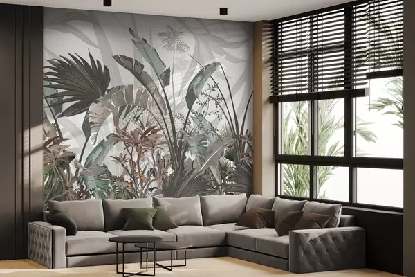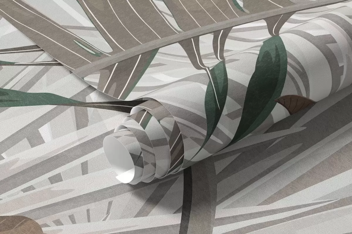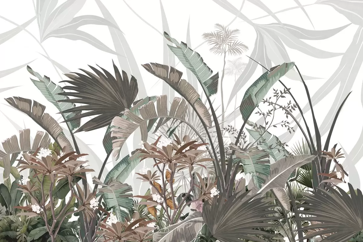 Fototapet Tropiska texturerade blad med blommor, palmer, plumeria-blommor, pastellfärger, vit bakgrund, djungel Nr. w09488