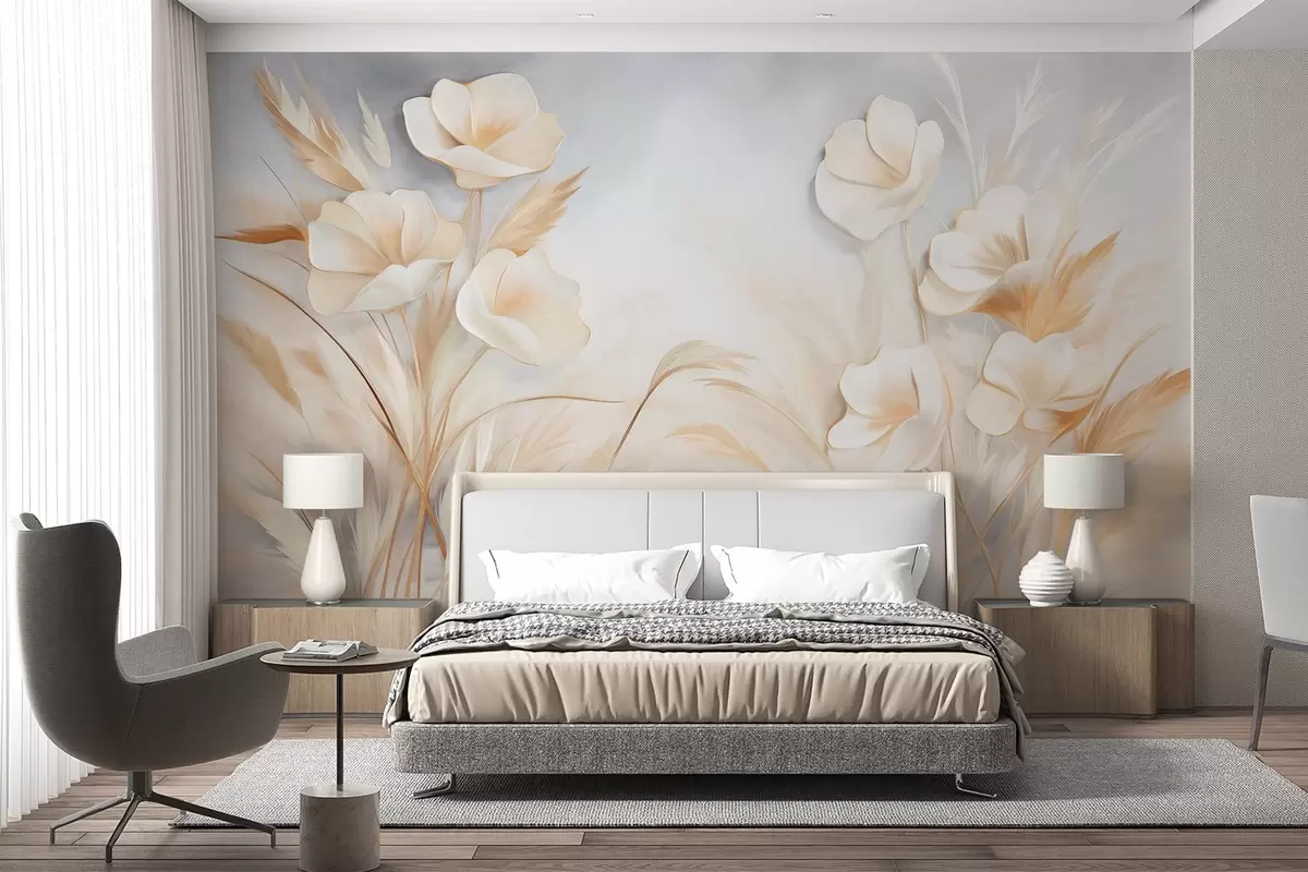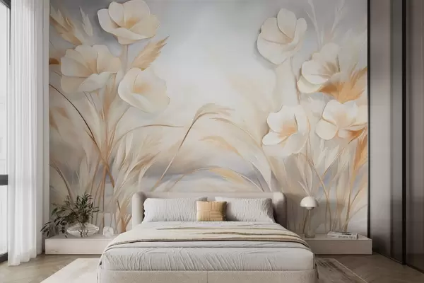 Fototapet Vita blommor, beige vass och pampasgräs, texturerad, elegant, minimalistisk stil, abstrakt landskapsbakgrund Nr. w09490