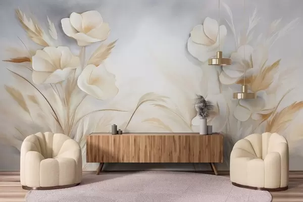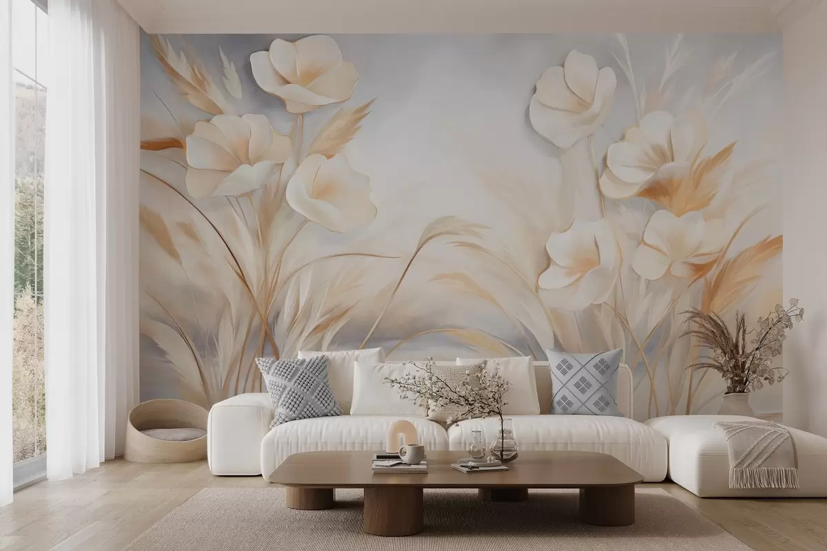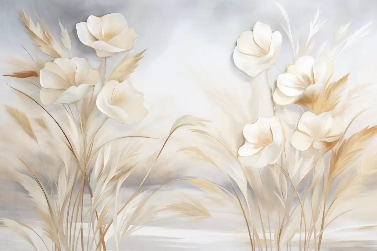 Fototapet Vita blommor, beige vass och pampasgräs, texturerad, elegant, minimalistisk stil, abstrakt landskapsbakgrund Nr. w09490