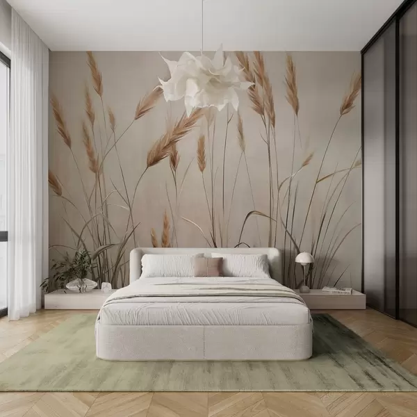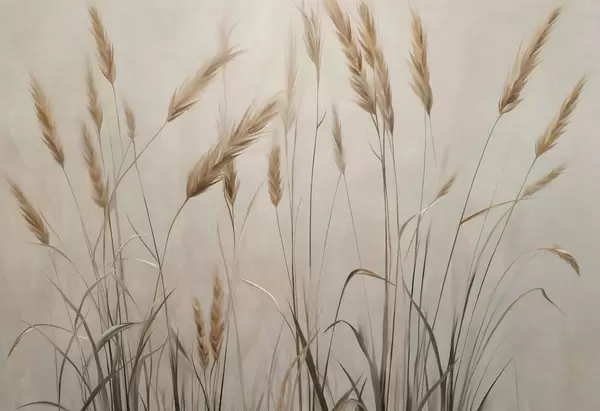 Fototapet Vetefält med gula ax, beige bakgrund, naturligt ljus, varma toner, detaljerade penseldrag Nr. w09493