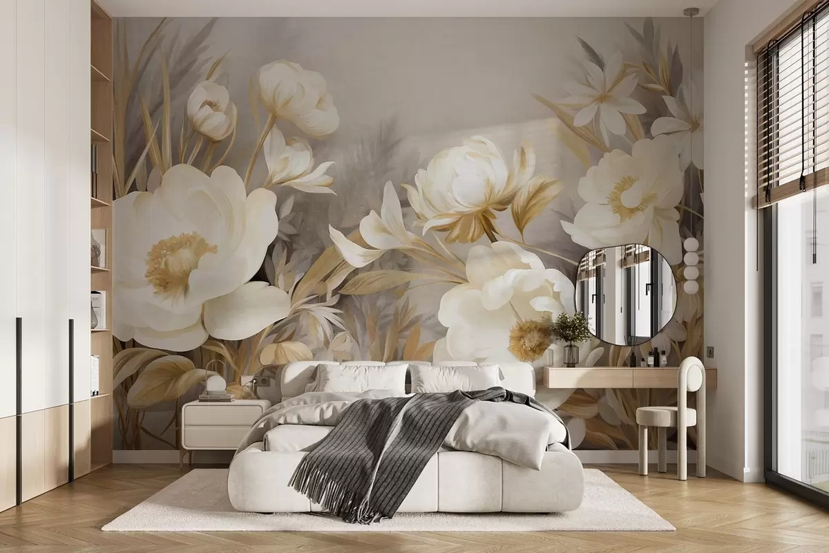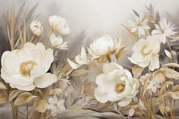 Fototapet Vita och gula pioner och andra blommor med högt gräs och blad i en mjuk, målerisk texturstil. Nr. w09494