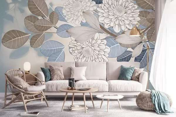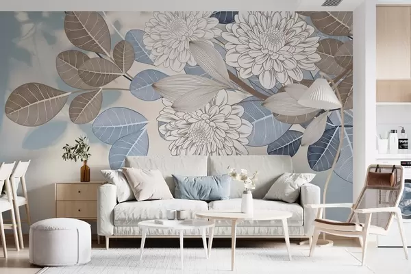 Fototapet Vita blommor med blå och bruna blad, ljusblå texturerad bakgrund, blomsterarrangemang, detaljerad linjekonst Nr. w09496
