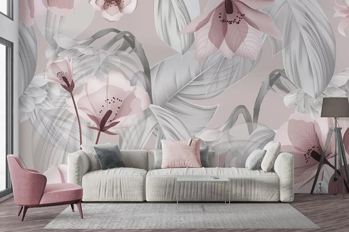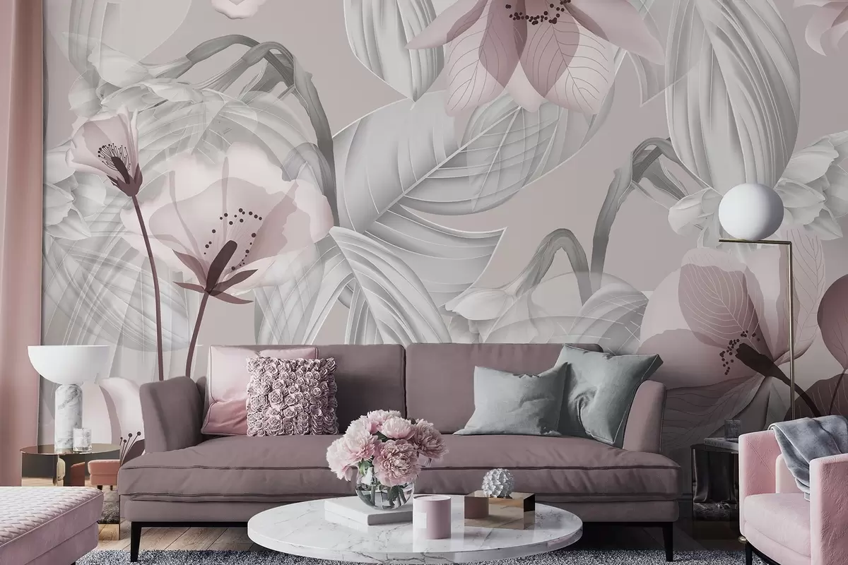 Fototapet Rosa blommor och grå blad, botanisk blommig bakgrund, elegant design, mjuka färger, lätta delikata detaljer Nr. w09497