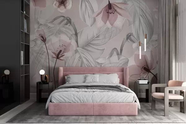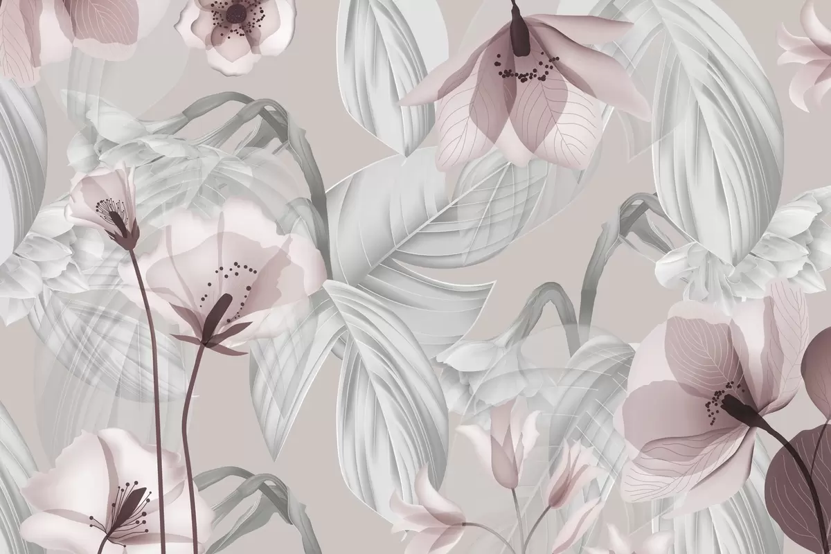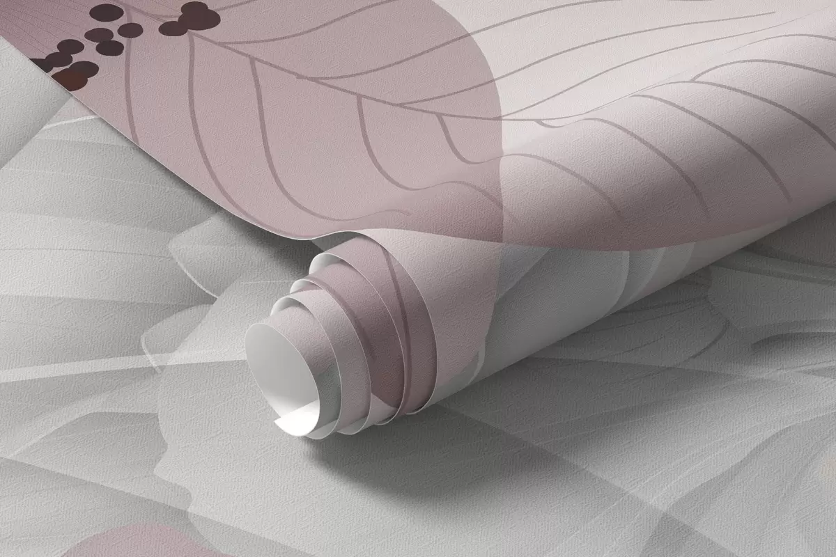 Fototapet Rosa blommor och grå blad, botanisk blommig bakgrund, elegant design, mjuka färger, lätta delikata detaljer Nr. w09497