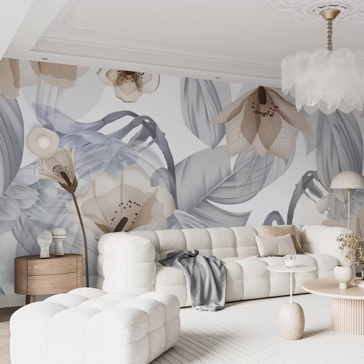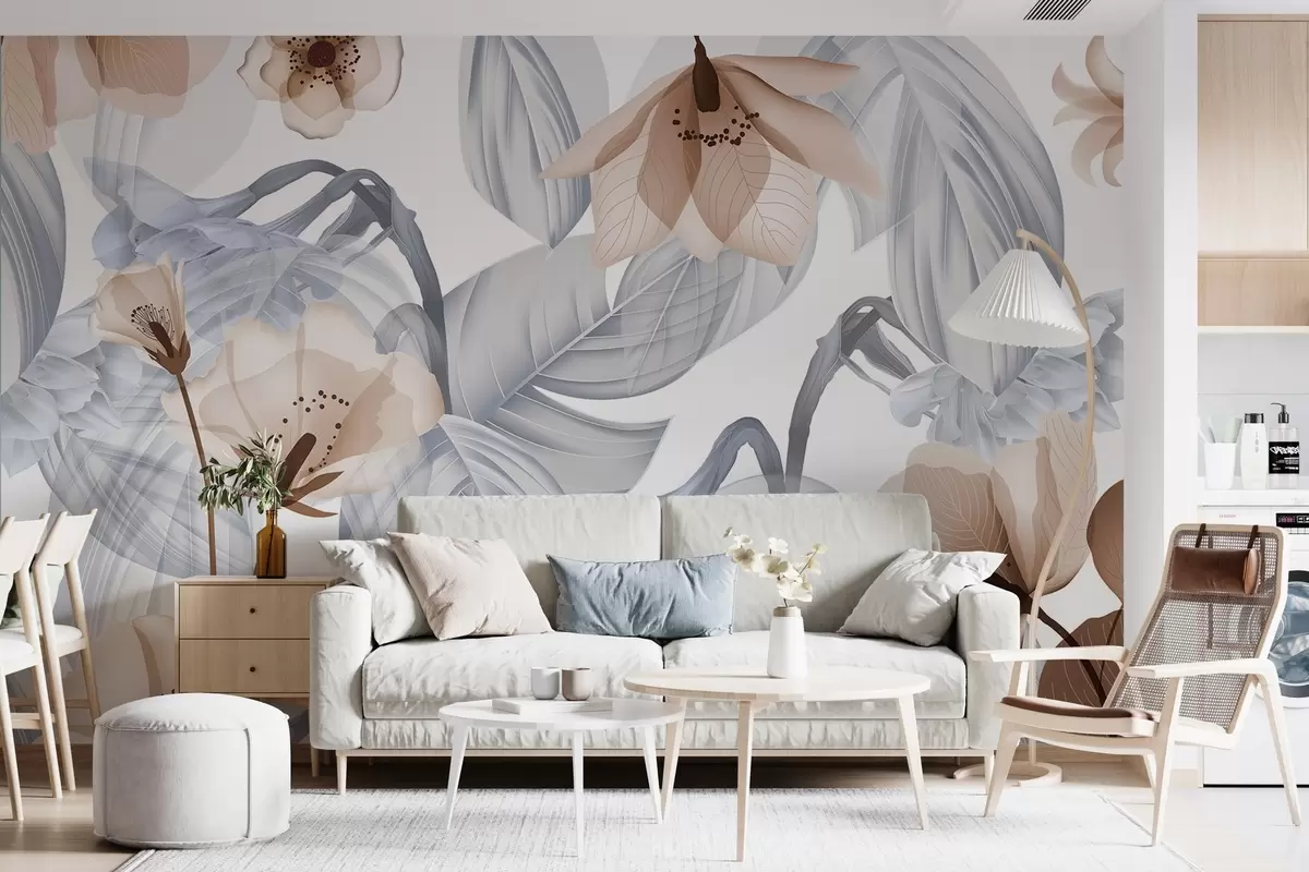 Fototapet Bruna blommor och grå blad, botanisk blommig bakgrund, elegant design, mjuka färger, lätta delikata detaljer Nr. w09497v1