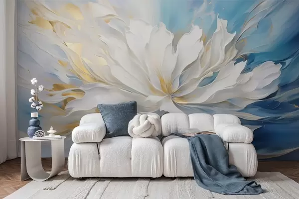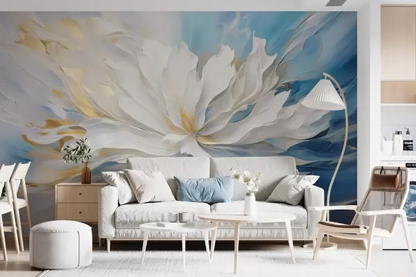 Fototapet Stor vit pion i oljemålningsstil på blågul bakgrund Nr. w09511
