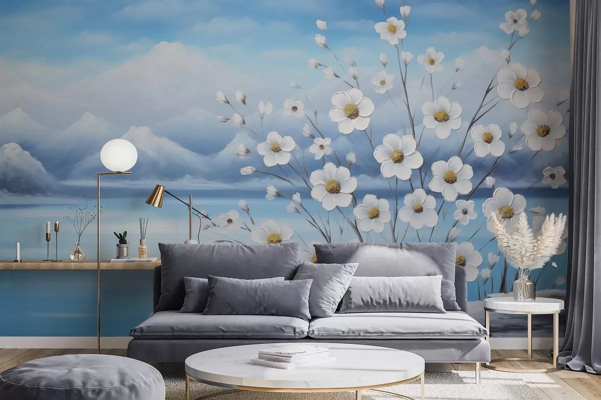 Fototapet Vita vårblommor vid en isig sjö med snöklädda berg i oljemålningsstil Nr. w09526