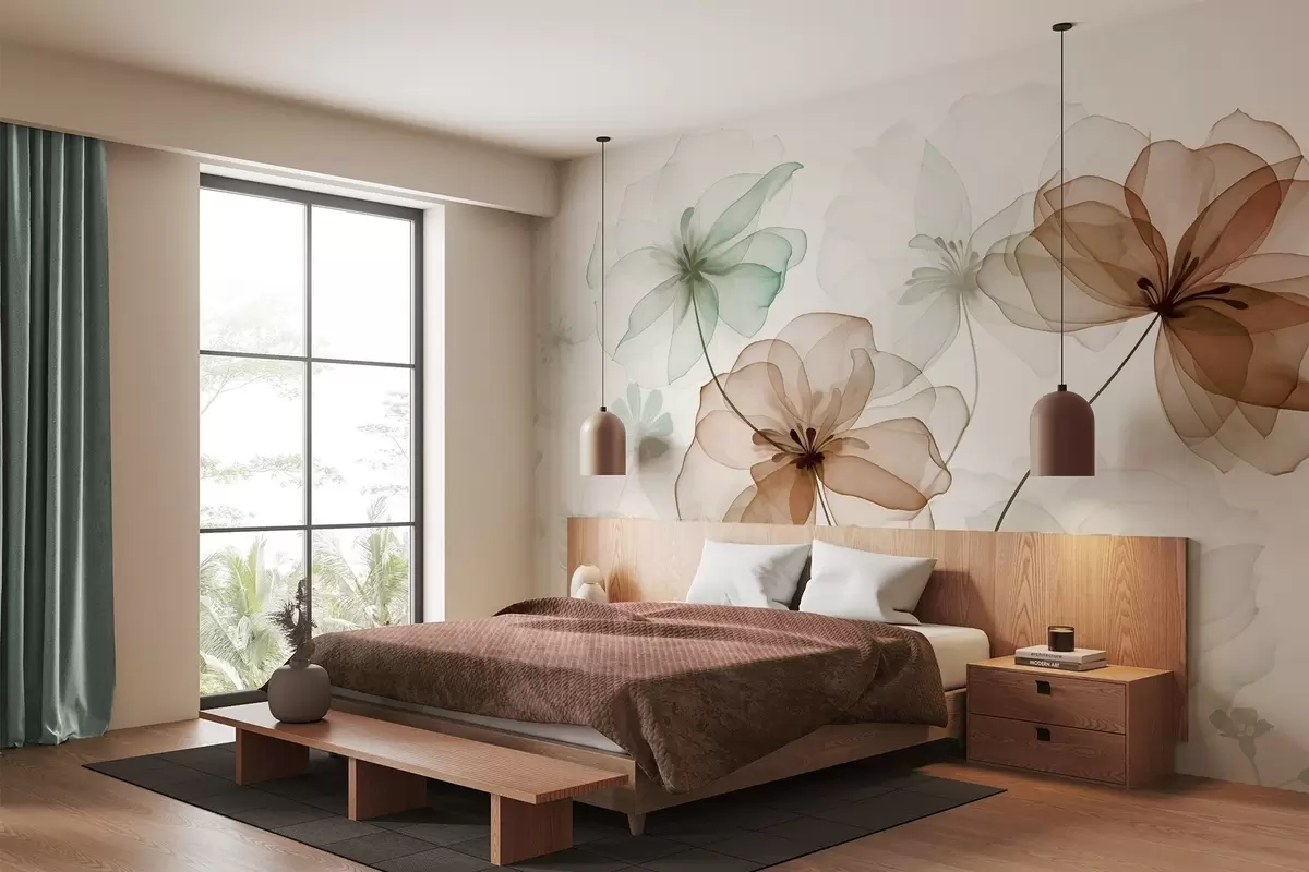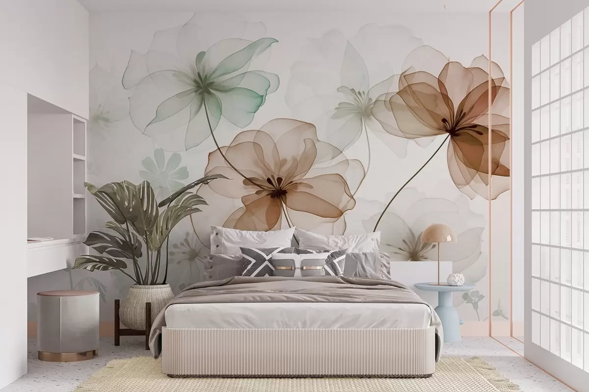 Fototapet Genomskinliga blommor med bruna och gröna kronblad, långa stjälkar, ljus bakgrund, mjuka färger, texturerat blommönster Nr. w09529