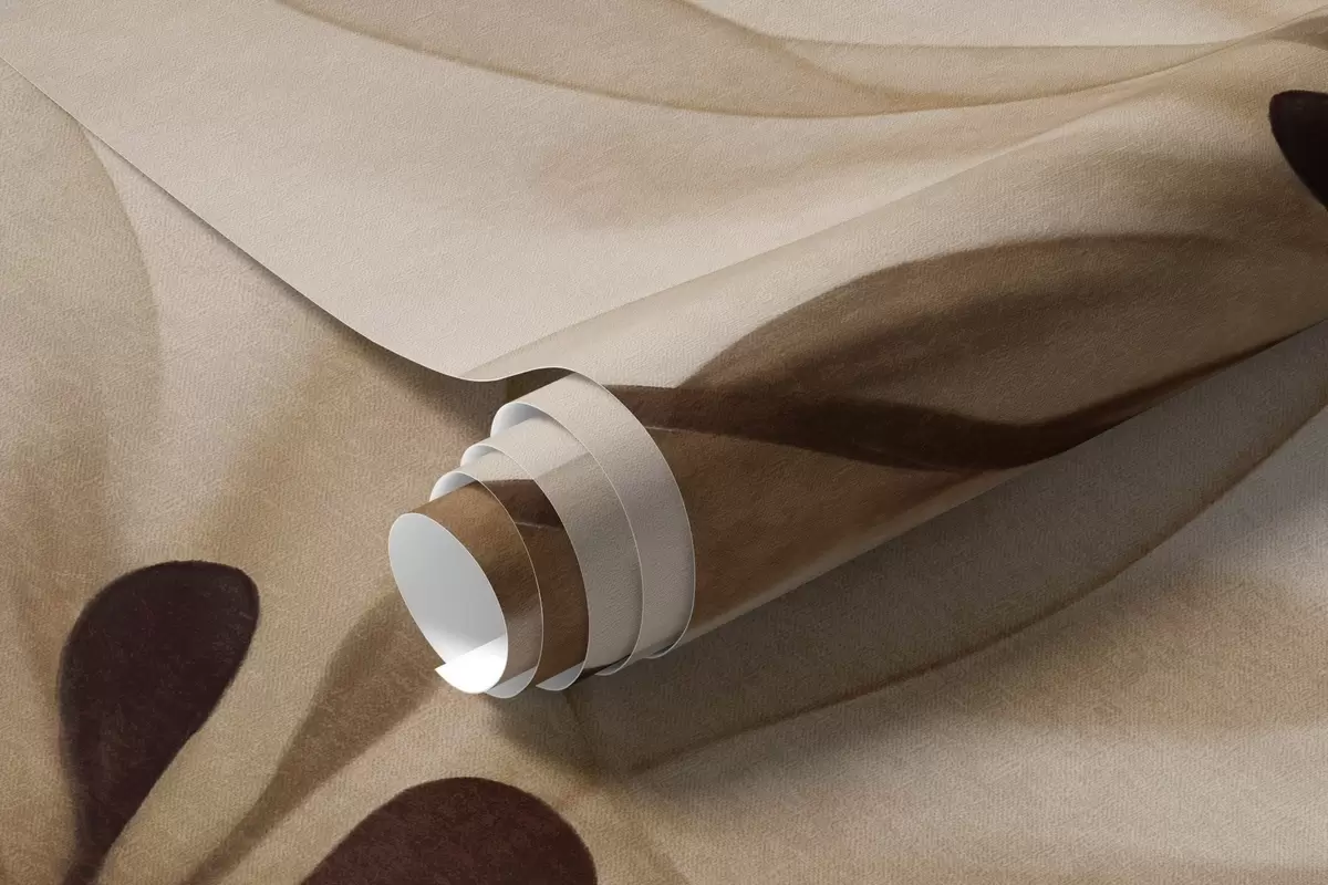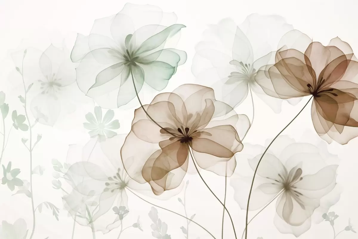 Fototapet Genomskinliga blommor med bruna och gröna kronblad, långa stjälkar, ljus bakgrund, mjuka färger, texturerat blommönster Nr. w09529