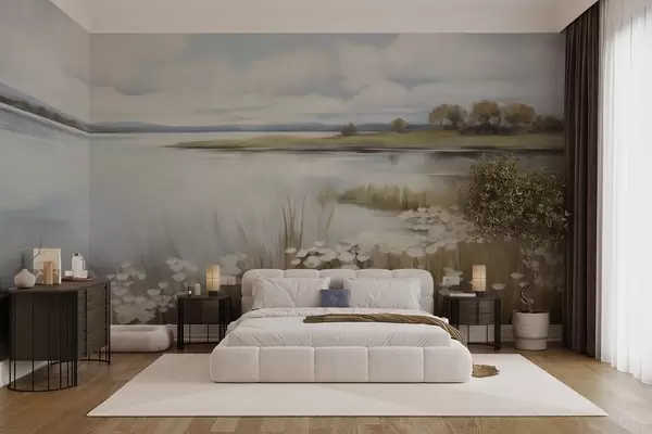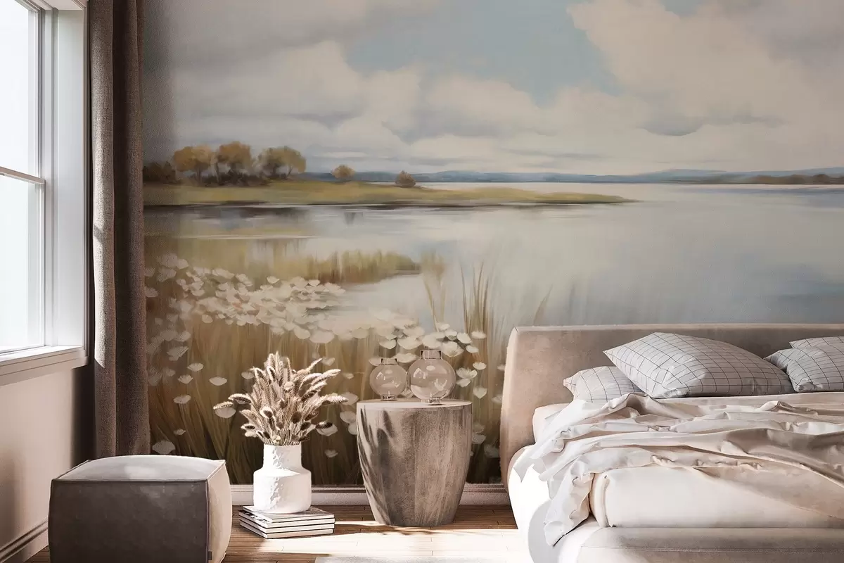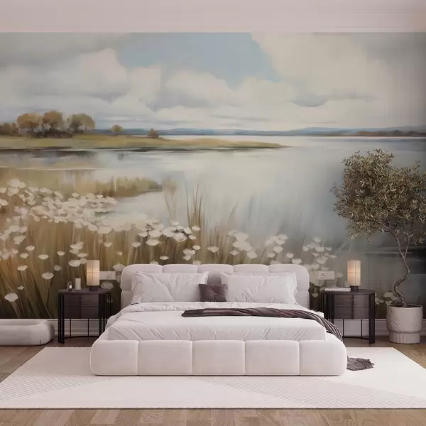 Fototapet Strukturerat landskap, fält med vita blommor och högt gräs, en sjö i bakgrunden, en gräsbevuxen kulle med träd, mjuka färger Nr. w09530