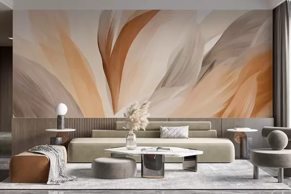 Fototapet Abstrakta texturerade fjädrar i brunt, vitt och grått och olika nyanser, överlappande på en vit bakgrund Nr. w09531