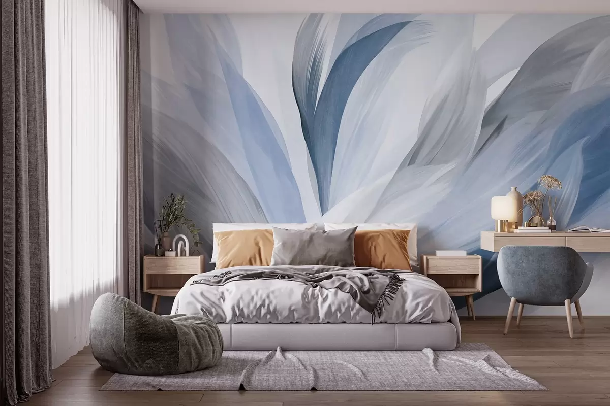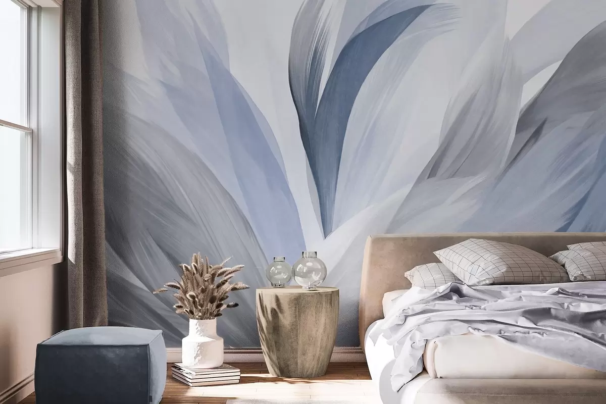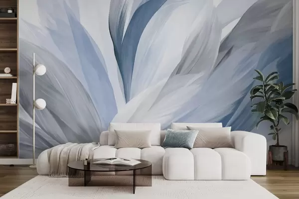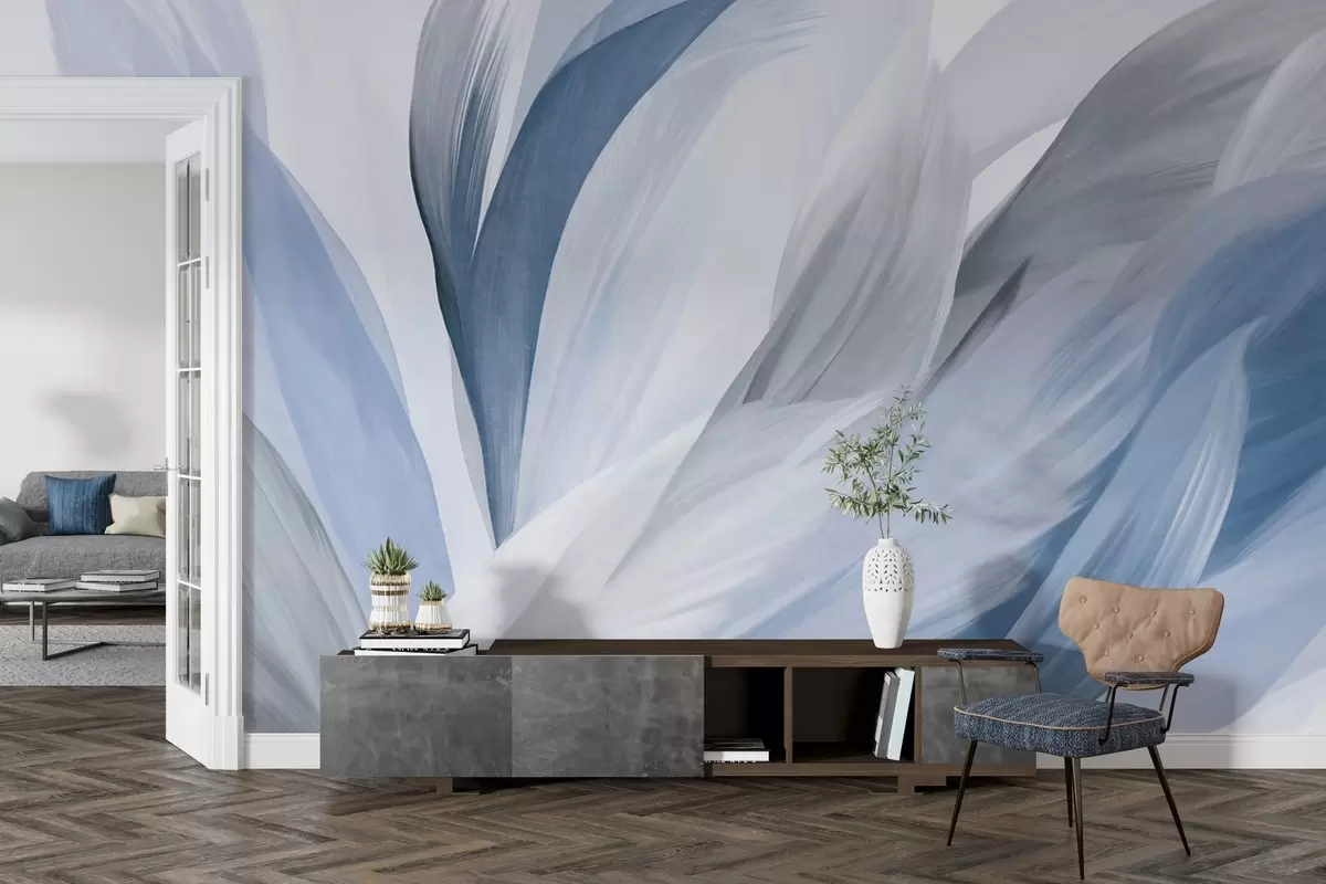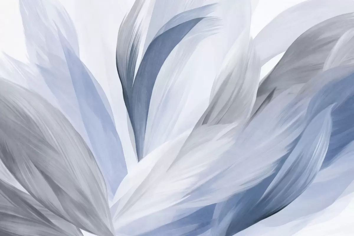 Fototapet Abstrakta texturerade fjädrar i blått, vitt och grått och olika nyanser, överlappande på en vit bakgrund Nr. w09531v1