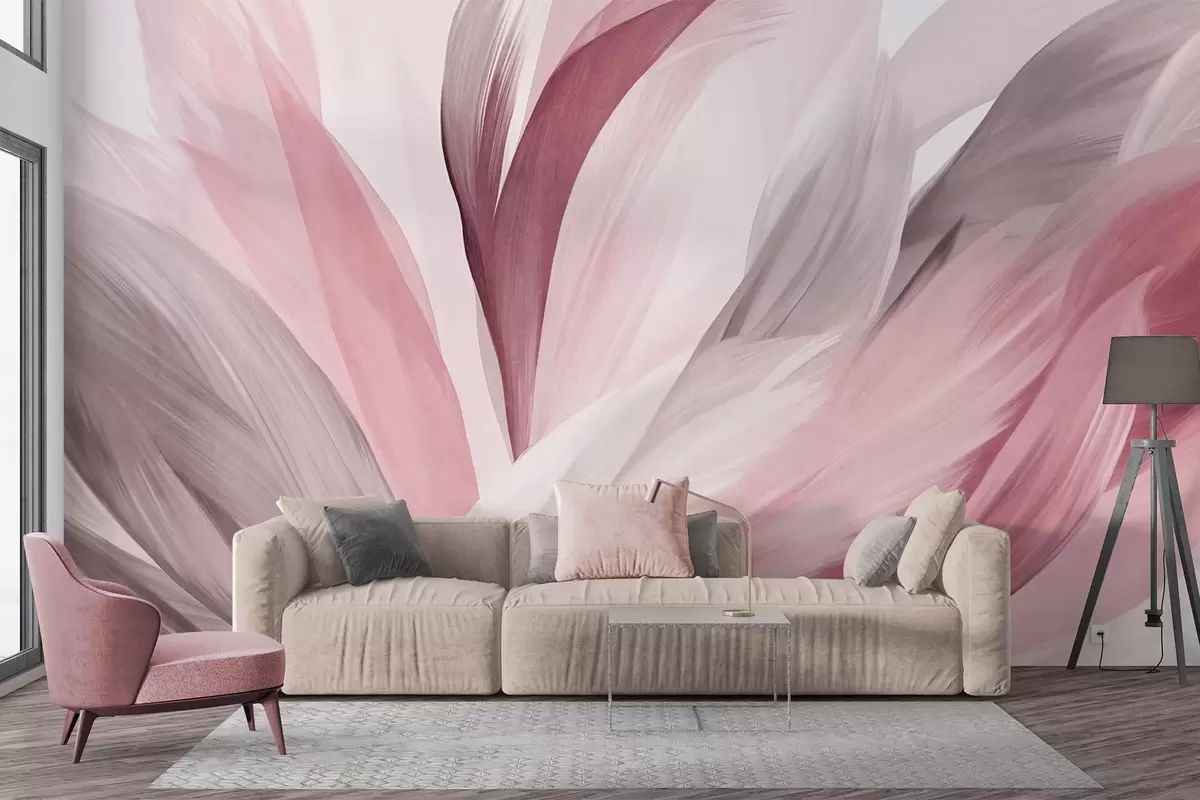Fototapet Abstrakta texturerade fjädrar i rosa, vitt och grått och olika nyanser, överlappande på en vit bakgrund Nr. w09531v2