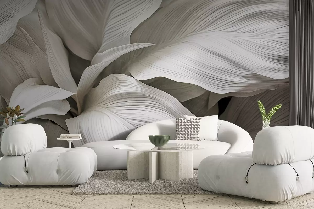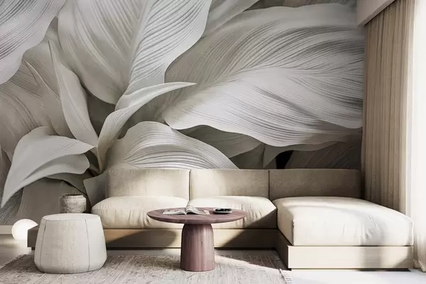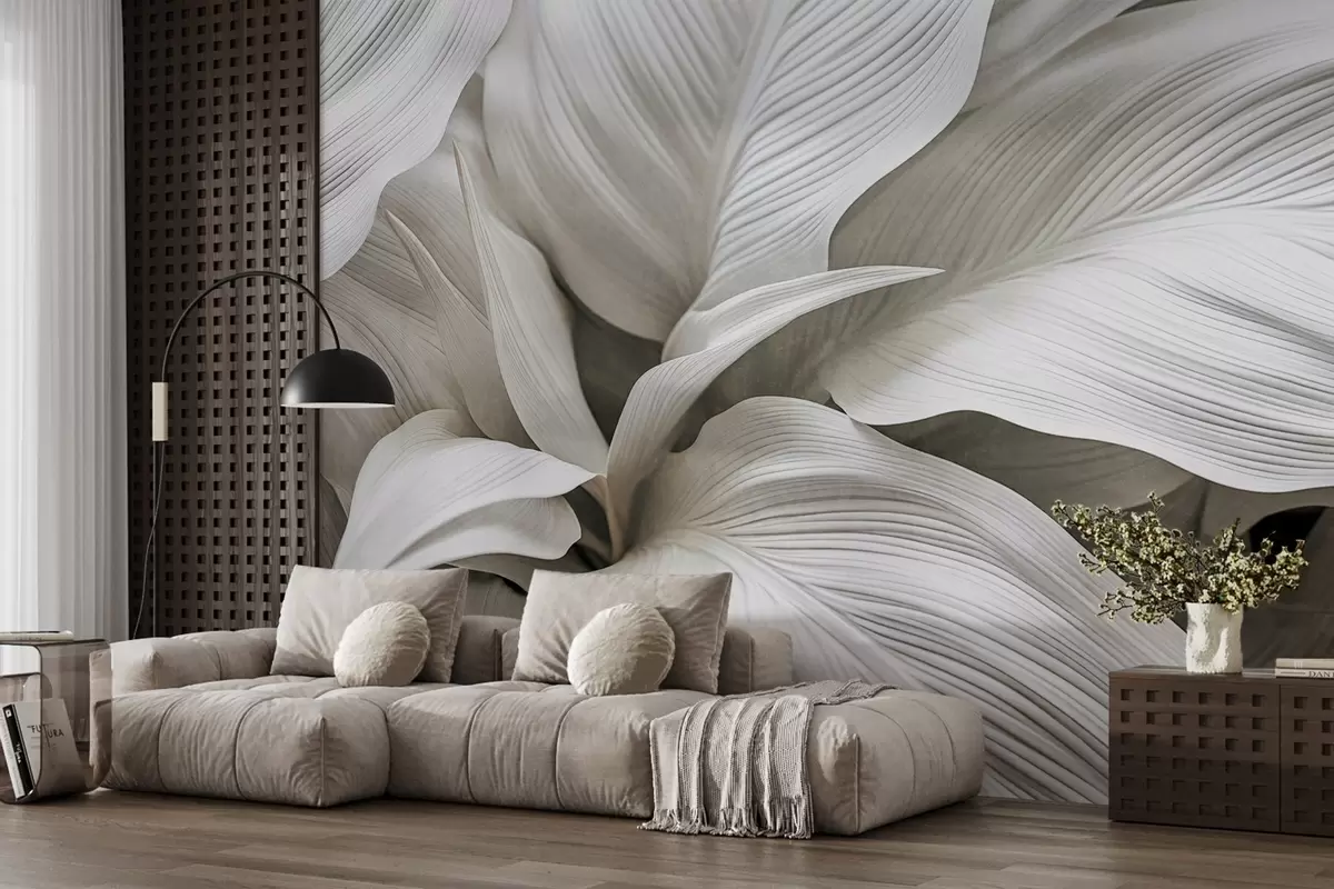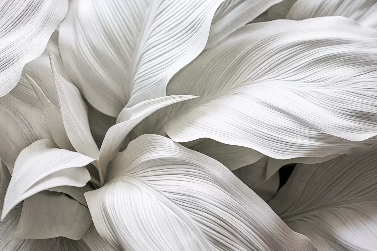 Fototapet Stora, strukturerade vita blad med framträdande ådror som överlappar varandra och skapar djup. Nr. w09536