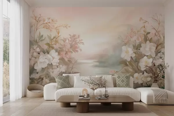 Fototapet Ett landskap med en flod omgiven av blommor och växter, mjuka färger, rosa himmel, akvarelltextur Nr. w09537