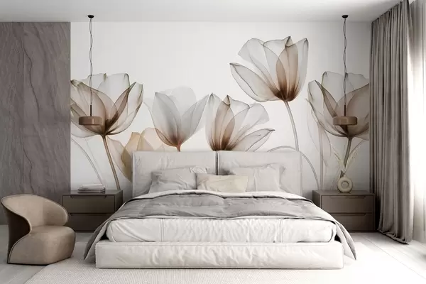Fototapet Genomskinliga bruna och vita tulpanblommor med långa stjälkar, mot ljus bakgrund, delikat och strukturerad blomsterkonst w09538v1