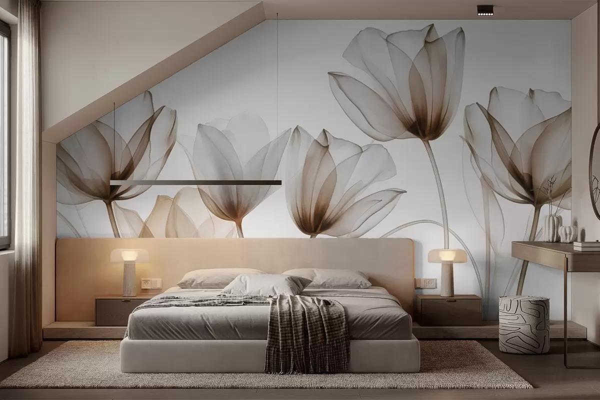 Fototapet Genomskinliga bruna och vita tulpanblommor med långa stjälkar, mot ljus bakgrund, delikat och strukturerad blomsterkonst Nr. w09538v1