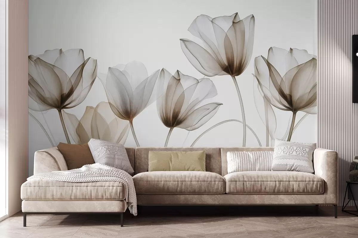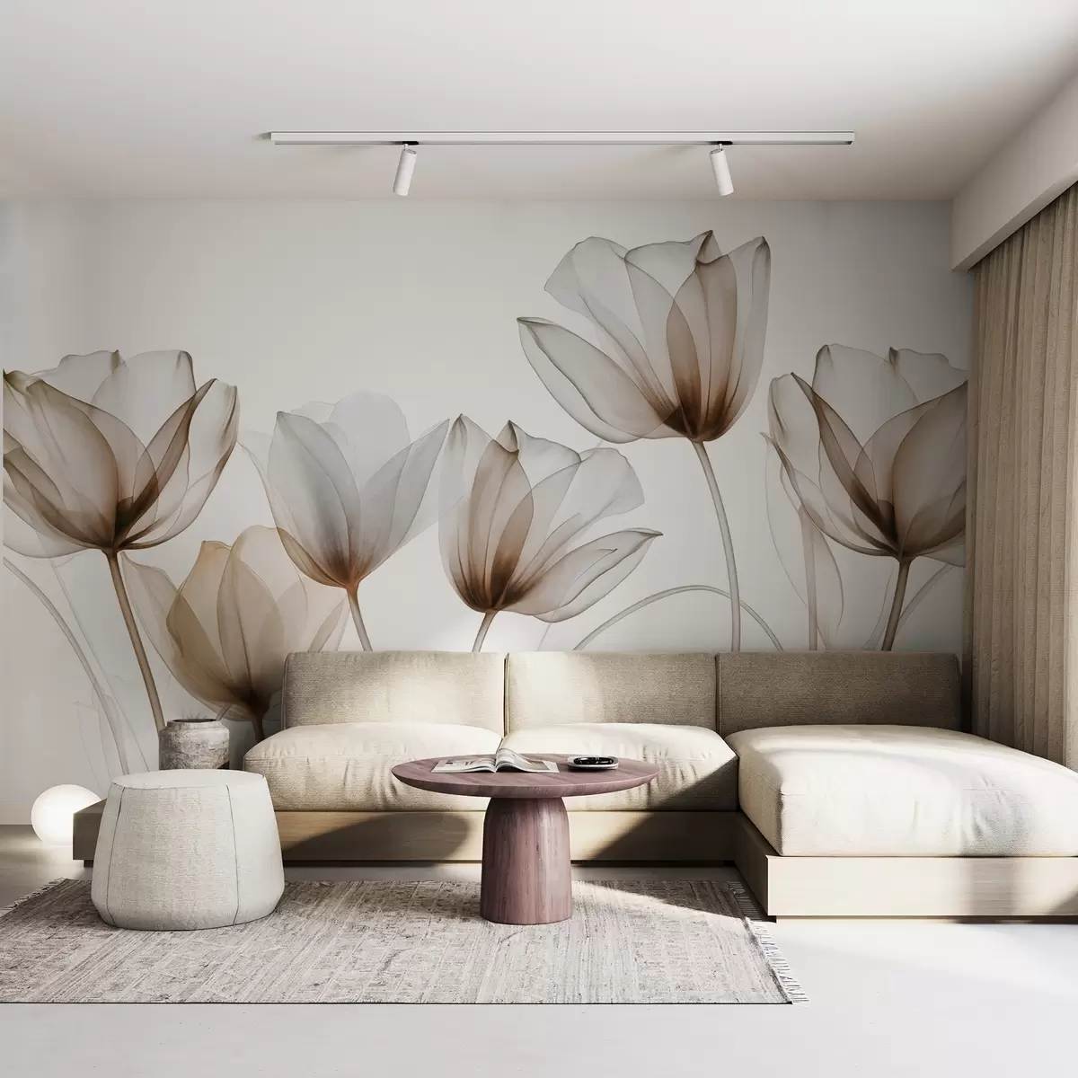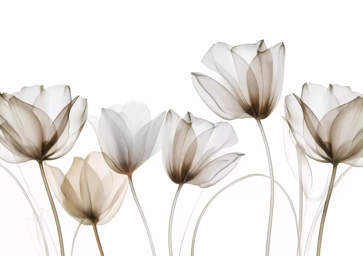 Fototapet Genomskinliga bruna och vita tulpanblommor med långa stjälkar, mot ljus bakgrund, delikat och strukturerad blomsterkonst Nr. w09538v1