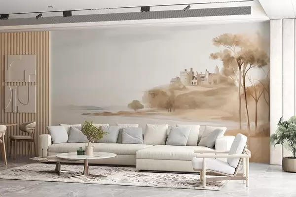Fototapet Landskap med ett slott på en kulle nära havet, en sandstrand i förgrunden, dämpade färger, texturerad konst Nr. w09540