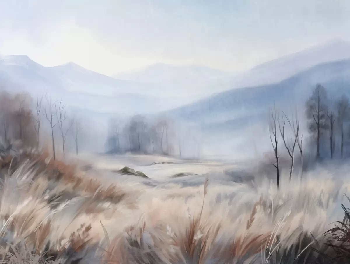 Fototapet Strukturerat landskap med torrt gräs i förgrunden och träd i bakgrunden, med berg i fjärran. Nr. w09542