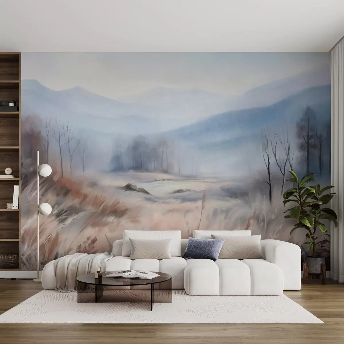 Fototapet Strukturerat landskap med torrt gräs i förgrunden och träd i bakgrunden, med berg i fjärran. Nr. w09542