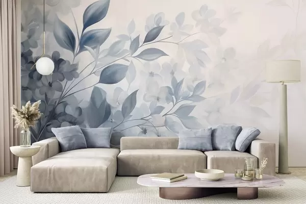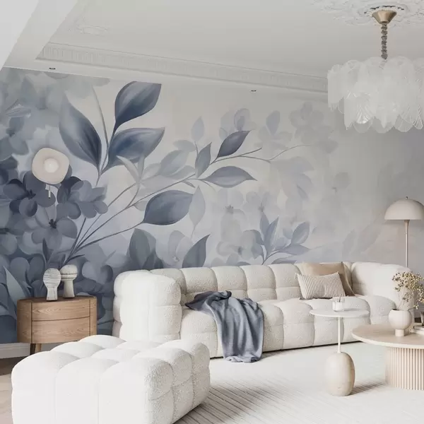 Fototapet Strukturerad blå och vit gren med blommor och blad som tonar ut i en ljus bakgrund i akvarellmålningsstil. Nr. w09543