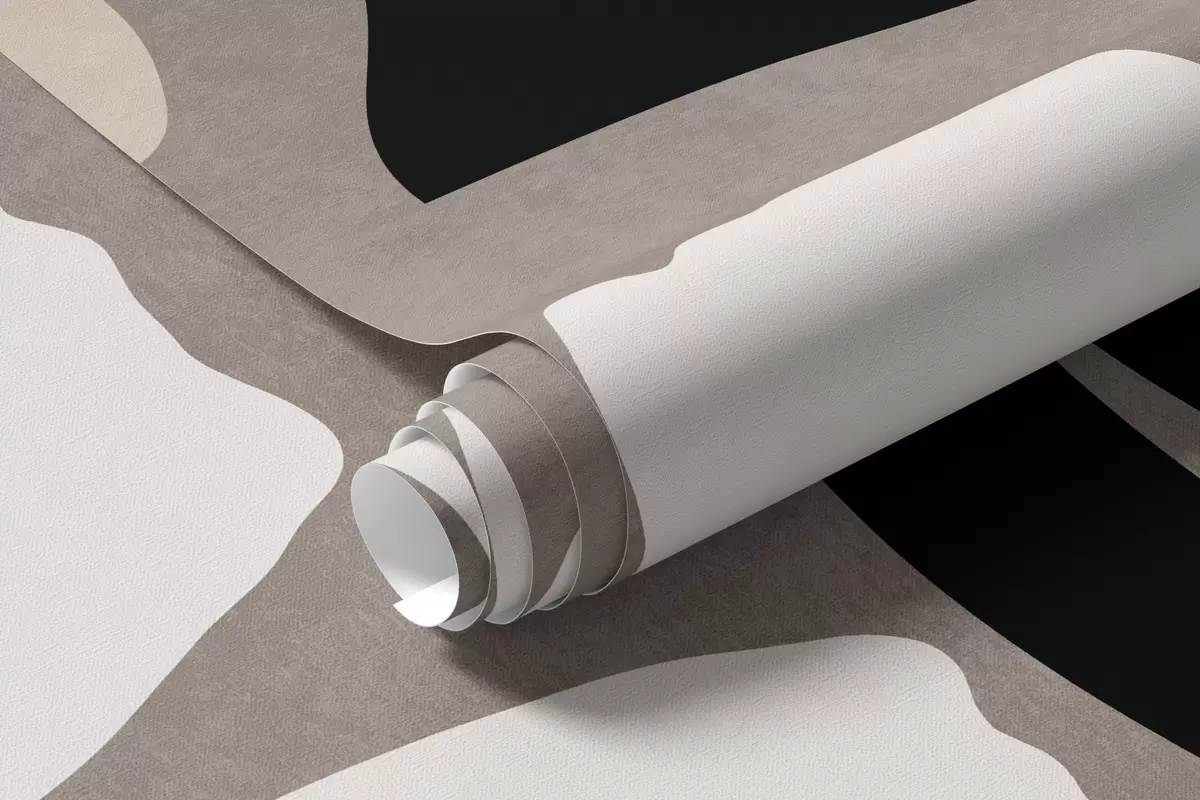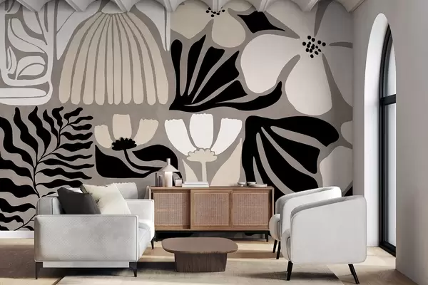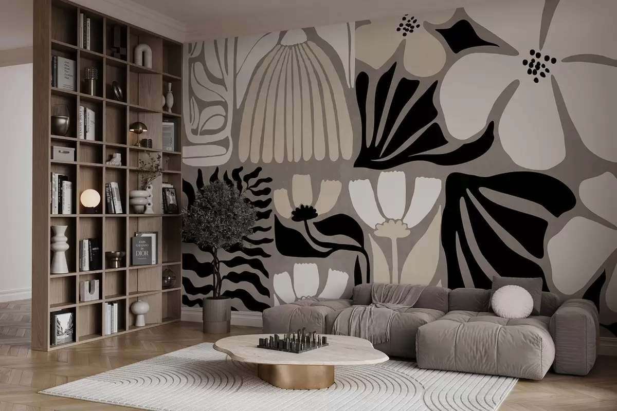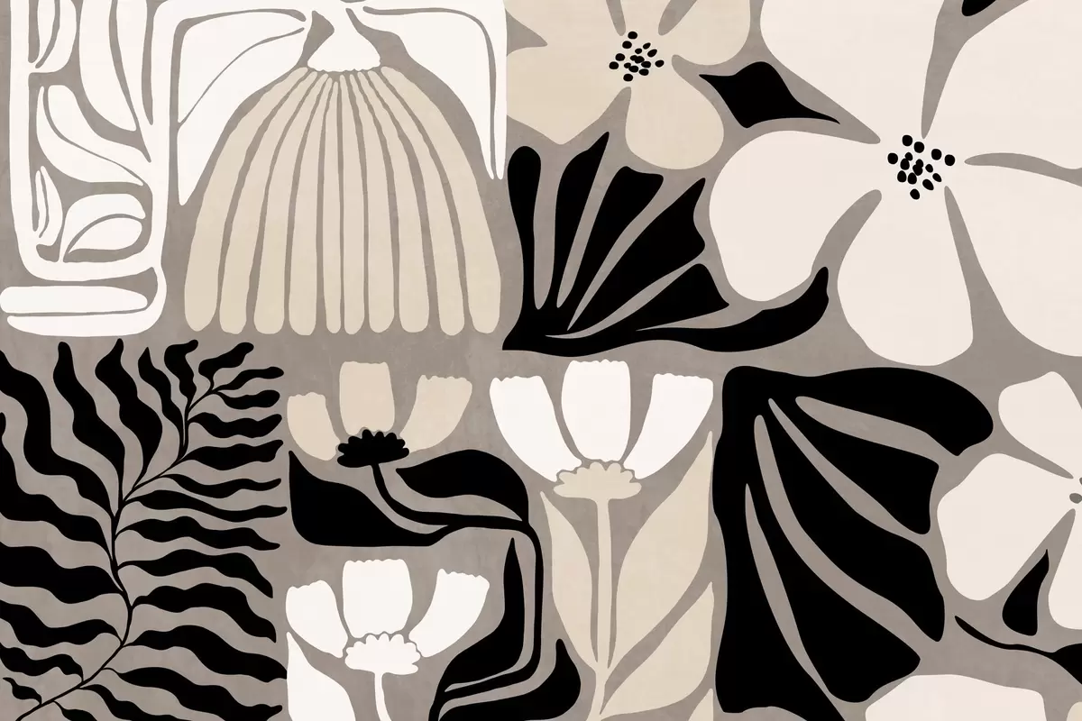 Fototapet Moderna minimalistiska stiliserade blommor och blad i beige, svart och vitt, texturerade på en grå bakgrund Nr. w09547