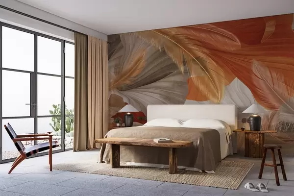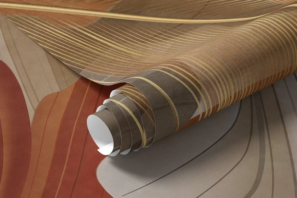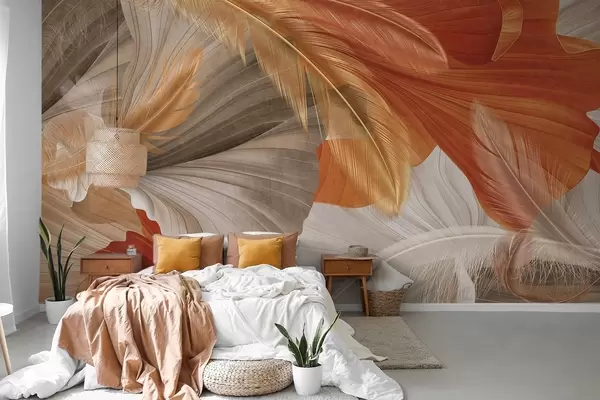 Fototapet Abstrakta texturerade stora flödande former i kräm- och rostfärger med delikata gula, beige och bruna fjädrar Nr. w09549