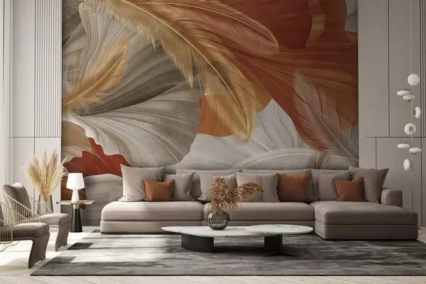 Fototapet Abstrakta texturerade stora flödande former i kräm- och rostfärger med delikata gula, beige och bruna fjädrar Nr. w09549