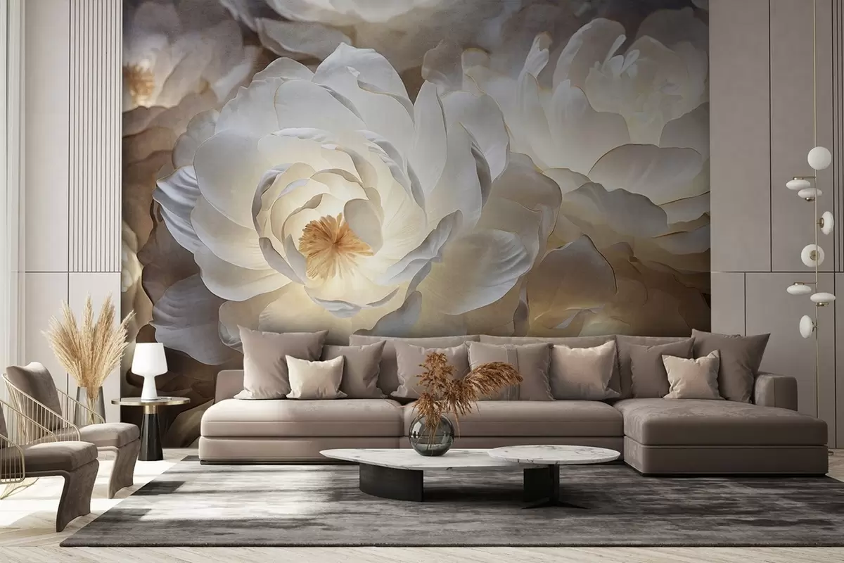 Fototapet Stora, vita fantasifulla pionblommor med gula centrum, mjuk belysning och delikata, texturerade lager av kronblad. Nr. w09550