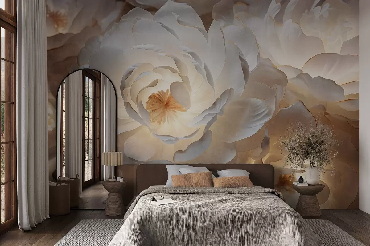 Fototapet Stora, vita fantasifulla pionblommor med gula centrum, mjuk belysning och delikata, texturerade lager av kronblad. Nr. w09550
